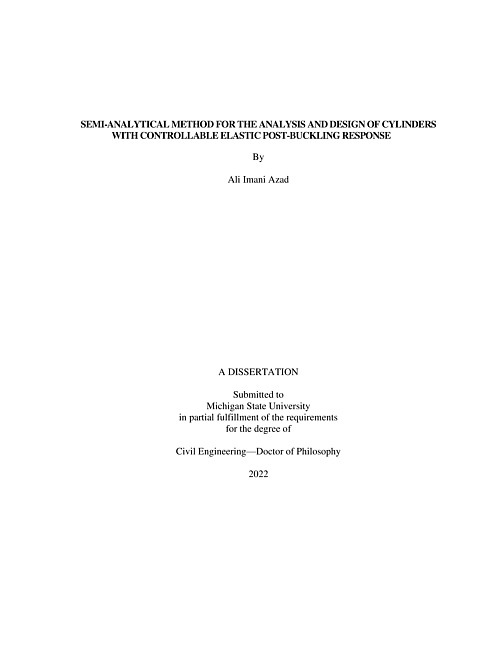 Research over the past ten years has generated an increased interest in studying elastic structural instabilities as a useful response for smart applications rather than a failure. Buckling under axial compression is a type of structural instability that can be used for rapid geometric transformations (switching) and energy harvesting applications, if the deformations arising from buckling are properly controlled. Controlling transverse deformations due to buckling in slender elements usually needs external constraints/boundaries. Short thin-walled cylinders can experience several elastic buckling events under axial compression without additional constraints. However, predicting the post-buckling response in cylinders is very challenging, particularly far in the post-buckling regime since they are highly sensitivity to initial imperfections.The concept of cylinders with non-uniform stiffness distribution (NSD) was recently proposed to localize a cylinder's buckling events in targeted zones. This notion has been proven effective for controlling the number of elastic buckling events, the sequence at which they occur, and the regions experiencing buckling. However, this information is not enough to design NSD cylinders for smart applications, which requires being able to predict the actual applied force for each buckling event, the end shortening of the cylinder for the buckling event, the drop in force, the drop in strain energy, and the post-buckling stiffness of the cylinder.Here, a semi-analytical model has been developed to predict the elastic post-buckling response of NSD cylinders under compression. The developed semi-analytical model is based on three general steps:⁰́ØSeparate the NSD cylinder into parallel segments,⁰́ØSimplify and predict the response of each segment, and⁰́ØIntegrate the response of individual segments.The first step in predicting the elastic post-buckling response of a cylindrical segment was to simplify its geometry into a cylindrical panel with uniform thickness. Linear springs are connected to the top and bottom of the uniform cylinder to match the stiffness of the simplified segment to the actual one. Based on classical shell theory, the elastic post-buckling response of a cylindrical panel is solved as a boundary value differential equation using the pseudo-arclength method. Comparing the post-buckling response of four cylinders from the proposed semi-analytical model with the response of the same cylinders from the experiment and finite element analysis showed the effectiveness of the proposed model. Results from the proposed model predict well the axial deformation and force level corresponding to buckling events more accurately than the post-buckling stiffness.The response of cylindrical panels for a large variety of dimensions is needed to design NSD cylinders for targeted post-buckling behavior. Thus, the classic differential equation of the cylindrical panels under axial compression was solved independently of the material's cylinder radius and elastic modulus. These results allowed the development of design maps for several post-buckling responses such as axial strain and stresses corresponding to the first buckling event, force, and energy drops from the buckling event, the secondary (or post-buckling) stiffness of the panel, the radial deformation at the panel center, and the maximum von Mises stress in the panel. By using genetic programming, predictive equations were developed for each design parameter to relate it to the geometry of the panels.Three cylinders were designed using the developed design maps to validate the proposed approach. One NSD cylinder was designed to undergo several buckling events under compression at pre-defined end shortenings. A second NSD cylinder was designed to feature a post-buckling force-deformation response that plateaus at a constant force level. The third cylinder was designed to experience the same force drop at each buckling event and in identical axial end shortenings after the first event. Finite element analyses of the designed cylinders verified that using the proposed design procedure using the developed design maps provides NSD cylinders with a post-buckling response that is very close to the desired one, and the ultimate design goal can be achieved by slight modifications to the geometry of the cylinder.This study advances the knowledge on the elastic buckling and post-buckling response of slender cylindrical shells under axial compression and provides an approach to analyze and design them for a desired far post-buckling response. The proposed framework, which combines the notion of decomposing NSD cylindrical segments into linear and nonlinear springs in series, a semi-analytical model for NSD equivalent panels, and design maps for several nonlinear responses provides insight for designing these elements for smart devices and structures relying on structural instabilities. This work expands the harnessing of elastic instabilities to the area of thin-shell buckling under compression, which has received less attention in comparison to other forms of structural instability.