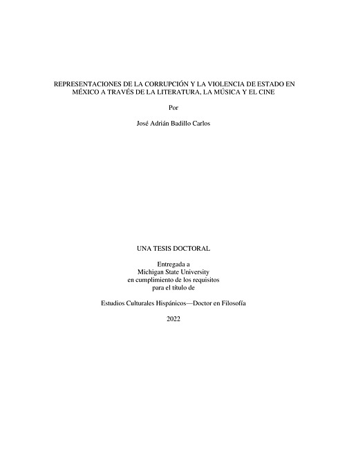 Esta disertacion examina las representaciones de la violencia y la corrupcion del Estado en Mexico mediante el analisis de obras literarias, musicales y cinematograficas desde principios de la decada de 1960 hasta la actualidad. El enfoque de este proyecto es analizar como la literatura y las producciones culturales han respondido ante el papel que ha desempenado el Estado mexicano en eventos historicos caracterizados por la violencia y la corrupcion. Este proyecto inicia con la Masacre de Tlatelolco ocurrida en 1968 en la Ciudad de Mexico. Por medio de la obra Regina, dos de octubre no se olvida (1988) de Antonio Velazco Pina se explora el intento del autor por recuperar una memoria historica y se analiza tambien las representaciones de la violencia de Estado en contra del movimiento estudiantil en 1968 y los efectos sociales, politicos y culturales que esto genera en la decada de los setentas. A traves de obras literarias como El amante de Janis Joplin (2001) de Elmer Mendoza y Trabajos del reino (2004) de Yuri Herrera, este trabajo analiza las representaciones ficticias de la violencia de Estado y el desarrollo del narcotrafico en la decada de los setentas, haciendo un enfasis en como se legitima y se representa la violencia subjetiva, sistemica y cultural. Desde el ambito musical, este proyecto tambien analiza las representaciones de la violencia a traves de generos musicales como el rock y los narcocorridos. A pesar del intento de censura por parte del Estado, ambos generos musicales han funcionado como una via de expresion popular para proponer una contra narrativa del discurso oficial al igual que para protestar los sistemas de corrupcion y violencia. Estas representaciones se profundizan aun mas en el cine mexicano a partir del cambio de gobierno ocurrido en el 2000. Por medio de La ley de Herodes (1999) y El infierno (2010) de Luis Estrada, este proyecto presenta un analisis de las representaciones de la violencia y la corrupcion desde una perspectiva satirica. El objetivo de este acercamiento es analizar los efectos de comicidad y reflexion que genera la satira al abordar representaciones de violencia, corrupcion y narcotrafico.