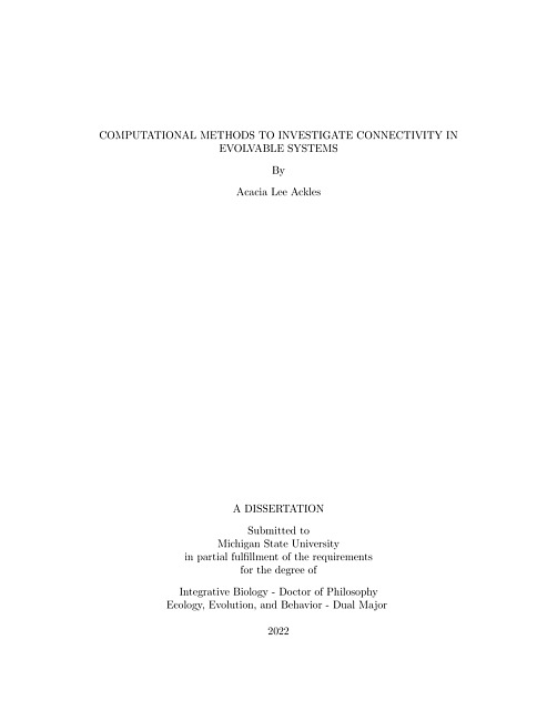 Evolution sheds light on all of biology, and evolutionary dynamics underlie some of the most pressing issues we face today. If we can deepen our understanding of evolution, we can better respond to these various challenges. However, studying such processes directly can be difficult; biological data is naturally messy, easily confounded, and often limited. Fortunately, we can use computational modeling to help simplify and systematically untangle complex evolutionary processes. The aim of this dissertation is therefore to develop innovative computational frameworks to describe, quantify, and build intuition about evolutionary phenomena, with a focus on connectivity within evolvable systems. Here I introduce three such computational frameworks which address the importance of connectivity in systems across scales.First, I introduce rank epistasis, a model of epistasis that does not rely on baseline assumptions of genetic interactions. Rank epistasis borrows rank-based comparison testing from parametric statistics to quantify mutational landscapes around a target locus and identify how much that landscape is perturbed by mutation at that locus. This model is able to correctly identify lack of epistasis where existing models fail, thereby providing better insight into connectivity at the genome level.Next, I describe the comparative hybrid method, an approach to piecewise study of complex phenotypes. This model creates hybridized structures of well-known cognitive substrates in order to address what facilitates the evolution of learning. The comparative hybrid model allowed us to identify both connectivity and discretization as important components to the evolution of cognition, as well as demonstrate how both these components interact in different cognitive structures. This approach highlights the importance of recognizing connected components at the level of the phenotype.Finally, I provide an engineering point of view for Tessevolve, a virtual reality enabled system for viewing fitness landscapes in multiple dimensions. While traditional methods have only allowed for 2D visualization, Tessevolve allows the user to view fitness landscapes scaled across 2D, 3D, and 4D. Visualizing these landscapes in multiple dimensions in an intuitive VR-based system allowed us to identify how landscape traversal changes as dimensions increase, demonstrating the way that connections between points across fitness landscapes are affected by dimensionality. As a whole, this dissertation looks at connectivity in computational structures across a broad range of biological scales. These methods and metrics therefore expand our computational toolkit for studying evolution in multiple systems of interest: genotypic, phenotypic, and at the whole landscape level.
