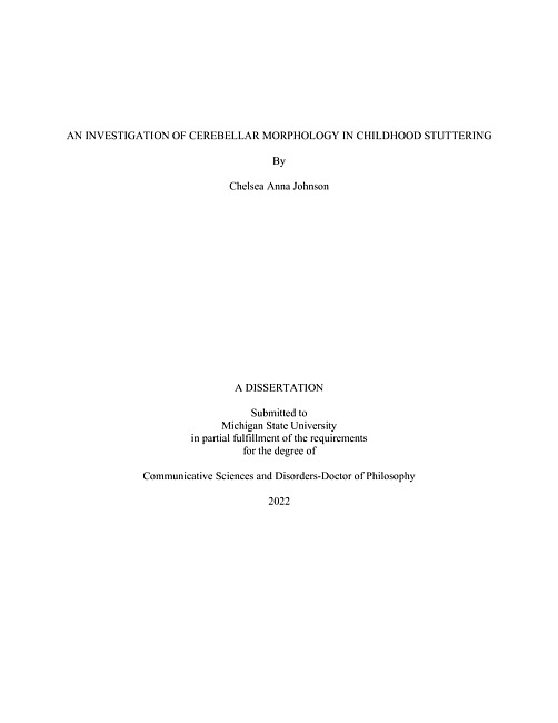 While many studies have connected structural and functional cerebellar differences to developmental stuttering, there are limited studies of cerebellar gray matter morphology in young children who stutter. These examinations include small sample sizes of children and use morphometry methods that might not be best suited for examining the cerebellum (e.g., Chang et al., 2008). This dissertation examines how the structure of specific cerebellar lobules differs in a larger cohort of children who stutter and children who do not stutter as well as in persistent and recovered children who stutter. These data will provide evidence to better inform predictions of how the morphology of cerebellar areas are likely involved in aspects of speech motor control in developmental stuttering. In this study, gray matter morphology of the cerebellum was examined in children who do and do not stutter using voxel-based morphometry and a specialized toolbox and atlas for the cerebellum (Diedrichsen, 2006). Here we examined cerebellar gray matter volume (GMV) based on structural MRI data from children who stutter and children who do not stutter, 116 preschool-age children (stuttering N = 57) between the ages of 3-5 years, and a school-age cohort of 72 children (stuttering N = 37) six years of age and up. This dissertation is the first study to examine cerebellar GMV in a large group of children who stutter using a specialized toolbox and atlas for the cerebellum. Results from this study showed that there were no overall significant group differences of lobular GMV between the stuttering and non-stuttering groups in any of the groups of children. There were significant age-related associations, however, that differentiated children who do and do not stutter in specific age ranges. In particular, the following cerebellar lobules differed significantly in GMV between children who do and do not stutter with age: 1) cerebellar lobule VII, which may correspond with cerebellar functions that support speech planning, 2) lobule VIII, which has been linked to various functions including corrections during perturbation studies, and 3) lobule IV which has been reported to be involved in feedforward control speech motor control processes. Notably, GMV of cerebellar lobule VI was associated negatively with Stuttering Severity Instrument (SSI) score in preschool-age persistent children who stutter. Associations between SSI score and GMV in cerebellar lobule VI may mean that feedforward control mechanisms are associated with the frequency of stuttering in children who stutter. In summary, significant findings of this investigation indicate that 1) children who do and do not stutter do not show an overall difference in cerebellar GMV, 2) GMV of the cerebellum is associated with SSI score, 3) age-related differences in GMV in the cerebellum differentiate children who do and do not stutter. The results from this study indicate that feedforward control is associated with disfluencies while age-related variations of cerebellar areas that may support both the feedback and feedforward control pathways are connected to aspects of stuttering, such as age.