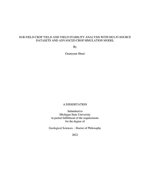 The combination of precision agriculture technology and big data allows farmers to improve the sustainability in crop production by improving profit and minimizing environmental loss. However, knowledge about managing sub-field yield variations over the years (yield stability) is less understood, so the actual adoption rate of precision technology is low, especially in small farms. The overarching goal of this dissertation was to evaluate the spatial and temporal variability of maize and soybean yields related to landscape characteristics and management in the U.S. Midwest (Chapter 1).Chapter 2 aims to develop a yield stability map using satellite images for ten maize/soybean main production states in the Corn Belt. This study uses Landsat images over eight years and common land unit polygons as the primary dataset to classify each field into stable high, stable low, and unstable areas. I further quantified nitrogen (N) balance and loss and associated monetary and environmental loss for each yield stability class. Across a wide range of crop growth environments, this large-scale analysis has shown reliable and consistent subfield yield patterns that could improve fertilizer application.Chapter 3 investigates the potential of these low-yielding areas in supporting biofuel crop (switchgrass) production to replace current crops and subsequent improvement in soil and climate change. I also proposed planting a cover crop, rye, to evaluate the effect on the soil nitrate level. The switchgrass and cover crop production were simulated by the Systems Approach to Land Use Sustainability (SALUS) model, which also modeled soil organic matter dynamics under the proposed and current (continuous maize or maize/soybean rotation) scenarios. Benefits such as reduced soil nitrogen, improved soil structure, and higher heterogeneity of landscape composition demonstrate the potential of yield stability maps to support sustainable agricultural production. In Chapter 4, I combined the yield stability maps with remote sensing images to improve the maize yield prediction at subfield scale. In this study, I first made a further division in the unstable area by including the topographic features and modeled cumulative crop water stress. The modeled water stress was combined with Landsat Analysis Ready Dataset (ARD) to predict maize yield using a random forest algorithm. Results showed that incorporating the modeled water stress with vegetation index derived from Landsat images produced the highest accuracy in estimated maize yield compared to satellite images alone. This work emphasized the yield stability map's ability to capture subfield spatial variations of soil and plant available water stress information.Chapter 5 compares the accuracy in yield level estimation between yield stability maps and high-resolution Planet images (3-m, bi-weekly) and analyzes the temporal changes of spatial variation of crop conditions during the growing season. The yield stability maps could predict similar maize yield levels in stable zones compared to satellite images. The temporal analysis in the spatial variation indicated greater changes in the field at the beginning or end of the season, while spatial patterns of crop growth dynamics remain stable in the mid-season. Early- or late-season changes did not always impact the final yield. This analysis provided an in-depth analysis of the in-season image so farmers could better monitor crops in real-time. Conclusions from these research projects and recommendations on interpretation yield and satellite images for sustainable production are presented in Chapter 6.