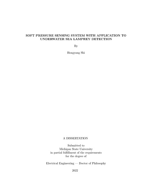 Species-specific monitoring offers fundamental tools for natural resource management and conservation but requires techniques that target species-specific traits or markers. Sea lamprey, a destructive invasive species in the Great Lakes in North America and conservation target in Europe, is among very few fishes that rely on oral suction during migration and spawning. Yet attachment by suction has not been exploited for sea lamprey control or conservation. This dissertation is focused on advancing soft pressure sensing systems for underwater sea lamprey detection.First, a pressure sensing panel based on commercial vacuum sensors is developed to measure the suction dynamics of juvenile and adult sea lampreys, such as pressure amplitude, frequency and suction duration. Measurements from an array of sensors indicate that the suction pressure distribution is largely uniform across the mouths of lampreys, and the suction pressure does not differ between static and flowing water conditions when the water velocity is lower than 0.45 m/s. Such biological information could inform the design of new systems to monitor behavior, distribution and abundance of lampreys. Based on the measured biological information, two types of soft pressure sensors are proposed for underwater sea lamprey detection. First, a soft capacitive pressure sensor is developed, which is made using a low-cost screen-printing process and can reliably detect both positive and negative pressures. The sensor is made with a soft dielectric layer and stretchable conductive polymer electrodes. Air gaps are designed and incorporated into the dielectric layer to significantly enhance the sample deformation and the response to pressures especially negative pressure. This soft capacitive pressure sensor can successfully detect non-conductive objects like plastic blocks compressed against it or rubber suction cup attached to it; however, it does not work well underwater since water causes parasitic capacitance on the sensor that interferes with the detection.The second sensor we present is a low-cost and efficient piezoresistive pressure sensor, which consists of a layer of piezoresistive film patch matrix sandwiched between two layers of perpendicular copper tape electrodes. Here, the measured two-point resistance is not equal to the actual cell resistance for that pixel due to the cross-talk effect of the pixels. Several regularized least-squares algorithms are proposed to reconstruct the cell resistance map from the two-point resistance measurements. Experiments show that this pressure sensor is able to capture the pressure profiles during sea lamprey attachment. The performance and computational complexity of the reconstruction algorithms with different regularization functions are also compared.Finally, we design an automated sea lamprey detection system based on the piezoresistive pressure sensor array using machine learning. Three types of object detection algorithms are deployed to learn features of the mapping contours when effective attachment by ''compression'' or ''suction'' is formed on the sensor array. Their validation performance and inference speeds are evaluated and compared in depth, and YOLOv5s proves to be the best detector. Furthermore, a detection approach based on the YOLOv5s model with a confidence filter unit, is proposed. In particular, different optimal detection thresholds are proposed for the compression and suction patterns, respectively, in order to reduce the false positive rate caused by the sensor's memory effect. The efficacy of the proposed method is supported with experimental results on real-time underwater detection of sea lampreys.