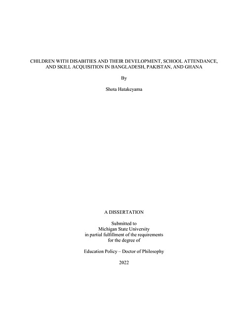 Children with disabilities in the Global South are one of the most marginalized groups in this world. While education enables them to escape from poverty, their schooling and learning status remains unclear due to a lack of comparable and comprehensive data. However, a new round of international household surveys overcomes this issue. Thus, I aim to understand their schooling and learning status and characteristics using the social and medical models of disability with the novel dataset from Bangladesh, Pakistan, and Ghana. I analyze these datasets using the linear probability model, logit model, and household-fixed effects model. The first part of my study examines the associations between disabilities and schooling/learning among school-age children. While disabilities are negatively associated with all aspects of schooling and learning in Bangladesh and Pakistan, it is negatively associated with learning and private school attendance only in Ghana. Thus, while the negative associations between disabilities and learning and private school attendance are observed consistently, the degree of negative associations between disabilities and public schooling differs across three countries. Accordingly, even though children with disabilities are one of the most marginalized groups of children in the Global South, global education stakeholders should scrutinize if it is true in their targeted countries to provide better education policy support. The second part analyzes whether factors predicted by the medical and social model of disabilities modify the associations between disabilities and education among school-age children. Some factors predicted by the social model of disability, such as household wealth, household location, and sex of a child, slightly modify the associations between disabilities and some aspects of education. However, factors predicted by the medical model, such as severity and type of disability, modify the associations. Especially, the negative associations are significant and large among those with severe disabilities and both types of disabilities listed and not listed in the Washington Group Short Survey. Further, although the definition set by the Washington Group does not count children with mild disabilities as children with disabilities, mild disabilities are slightly negatively associated with learning. My findings suggest that global education stakeholders should provide support to those with significant disabilities (severe or multiple) to ensure their schooling. At the same time, global education stakeholders currently work on learning poverty and learning loss, but even children with mild disabilities should be prioritized to realize their targets.The third part scrutinizes if the associations found in the first and second parts can be observed even among pre-school age children. Findings between school-age and preschool-age children are similar. Although disabilities are negatively associated with access to early childhood education and child development, the degree of the associations differs across the countries. Further, compared to the factors predicated by the social model of disability, those predicted by the medical model are more significantly negatively associated with early schooling and learning. My findings indicate that global education stakeholders should address the educational needs of children with disabilities even before their primary school entrance.
