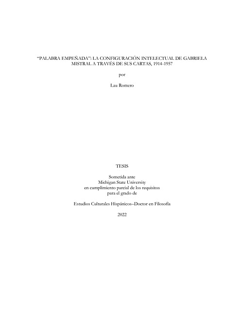 Gabriela Mistral (1889 - 1957) fue la primera mujer latinoamericana en obtener el Premio Nobel de Literatura, en 1945. Su reconocimiento como una fue tardio en su pais natal, Chile, donde recibio el Premio Nacional de Literatura en 1951. Esta tesis investiga la correspondencia privada de Gabriela Mistral durante el periodo 1914 a 1957 para buscar otra explicacion al fenomeno mistraliano fuera de su innegable talento. En otras palabras, esta investigacion se centra en aquellas estrategias que la escritora despliega dentro del campo cultural tanto chileno como internacional (Pierre Bourdieu 1990; Toril Moi 1999; Gonzalo Catalan 1985) para asegurar su sitio dentro del mismo, expandir sus redes intelectuales y afectivas, y proteger su continuidad a traves de la obtencion de capital simbolico. La organizacion de la tesis, compuesta en cuatro capitulos, gira en torno a "nudos" en los cuales la trayectoria profesional de Mistral -y su capital acumulado- se pone en riesgo y/o se refuerzan a traves del establecimiento de alianzas, amistades y favores. De alli tambien que la hipotesis principal se organice en torno a la "palabra empenada", como moneda de intercambio que posibilita no solo diversas performances por parte de la autora, sino tambien por parte de sus interlocutores.