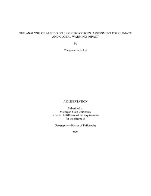 What if the production and expansion of bioenergy crops was realized? What bioenergy crops would be planted? Which crops would be sustainable? How would bioenergy affect landscape dynamics, surface reflectivity and global warming impact? These core questions are investigated in this dissertation by investigating the effects of agronomic practices, climate and crop-species on albedo in southwest Michigan. Albedo changes can be quantified in terms of global radiative forcing (RF), which can be positive or negative, correlating to carbon emissions or sequestrations in biofuel ecosystems respectively. With an overarching hypothesis which aims to understand how albedo is dependent on the landscape (i.e., crop-species type), climate variables (i.e., micrometeorological, temporal, and seasonal) and agricultural practices (i.e., fertilization, stover retention), which in turn affect its global warming impact and the ability to reflect more sunlight back into the atmosphere and sequester carbon. As a result, the Kellogg Biological Station was selected as the study site. This research analyzes changes in albedo over seven different biofuel crops at the Biofuel Cropping System Experiment (BCSE), situated at the Great Lakes Bioenergy Research Center (GLBRC). This dissertation investigates the radiative forcing associated with each one of the bioenergy scenarios, in order to model the conversion of a landscape into a relatable carbon dioxide equivalent. This CO2 equivalent-called global warming impact (GWI)-allows for a climate impact comparison of potential global warming impact of CO2 emissions from biofuels relative to a reference gas to investigate potential climate warming/cool impacts. This research examined annual row crops of maize and energy sorghum, monoculture perennial grasses of switchgrass and miscanthus, and polyculture perennials of native grasses, early successional grassland and restored prairie bioenergy systems. Each chapter provides a deeper analysis into the spatiotemporal effects of surface reflectivity on biofuel ecosystems and provides an understanding of the total global warming impact of different croplands and their contribution to the energy budget and carbon production. Results of this research include: 1) a long-term network of towers which effectively measure albedo continuously over multiple biofuel ecosystems, and 2) regionalized instantaneous data from landscapes of candidate bioenergy crops to significantly advance knowledge and understanding in how surface reflectivity affects GWI. Major findings indicated that albedo observations are an invaluable tool in order to calculate and improve climate models, in order to understand how land use and land cover affects albedo and climate cooling. Perennial grasses provided a sustainable form of climate mitigation by reflecting more solar radiation back into the atmosphere, and can sustainability provide localized cooling while reducing the need for fertilizer input. Finally, an overall cooling effect from modeling the conversion of historical landscape forest and modern landscapes of maize over a three-year study period to candidate different bioenergy crops was found, which indicated a climate warming mitigation from long-term increased surface albedo reflectance.
