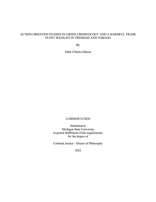 This dissertation presents five chapters, inclusive of three manuscripts styled as draft publications, to advance the contested paradigm of green criminology-or the study of crimes and harms that involve the natural world, non-human species, and the human communities that depend on them-and to support the emerging professional practice of non-governmental wildlife trade reduction. Two of the presented manuscripts meet the requirements for submission to scientific journals in criminology, while another is a long-form text modeled on contemporary non-governmental 'wildlife trade assessment' reports. The specific wildlife trade under study is a harmful trade in pet wildlife occurring in Trinidad and Tobago and the wider world. This trade was particularly under-studied prior to this dissertation research project and broader initiative. The dissertation is action-oriented in that it seeks to support the green criminology paradigm's empirical, theoretical, and technical development. The resulting manuscript-style chapters have been designed using a best-practice 'Open Standards' planning approach now popular in wildlife trade reduction projects. The underlying research activities were also action-oriented in that they were and continue to be conducted in partnership with local activists and scientists as part of a non-governmental project to reduce the harmful trade in pet wildlife trade in Trinidad and Tobago (see www.nurturenaturett.org). The underlying research included focus group discussions with wild animal keepers (n=75), key informant interviews (n=172) with seven stakeholder groups, more than two years of participant observation of physical sites and social media, a national household survey on animal keeping (n=2004), and a taxonomic legal inventory of wildlife laws in Trinidad and Tobago and its trade partners. The first chapter, "Introduction," provides essential background information on the dissertation research, encompassing project, and implementing researcher. In this way, the chapter describes the developmental context of this dissertation thesis and the strategies employed to produce the dissertation chapters. The second chapter, "The illegal keeping of pet wildlife in Trinidad and Tobago: Diversity, prevalence, populations, and harms," is designed for submission to a criminological journal on global crime issues and provides insights into the nature of an illegal wildlife trade in a Caribbean country. The third chapter, "'We all know it's inhumane': The awareness and justification of green crimes and harms among Trinidadian songbird keepers," is designed for submission to a criminological journal on social deviance and provides insights for the development of Neutralization Theory to reduce green crimes and harms. The fourth chapter, "An assessment of the harmful trade in songbirds in Trinidad and Tobago and the wider world," is designed as a gray-literature 'wildlife trade assessment' to educate and empower activists, donors, and policymakers in Trinidad and Tobago and the wider world. A final chapter, "Conclusion and Reflections," considers the researcher's experience in relation to action, green criminology, project-based intervention, and science-based activism. The researcher's concluding reflections include the identification of several next steps to advance green criminology for the continuing and future reduction of harmful wildlife trades and other green crimes and harms.