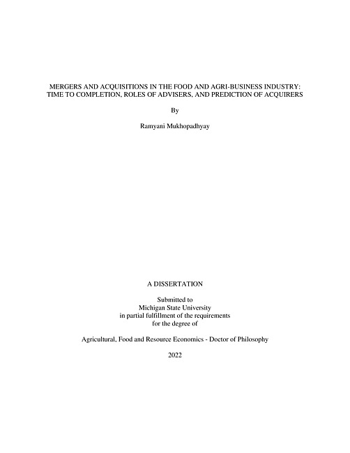 Mergers and acquisitions in the food and agri-business industry : time to completion, roles of advisers, and prediction of acquirers