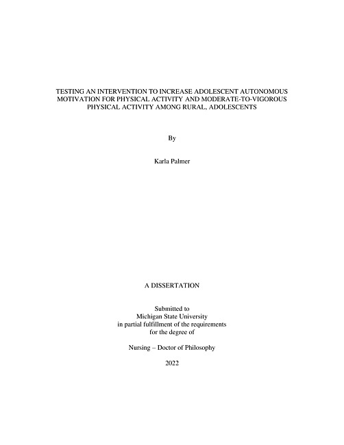Daily moderate to vigorous physical activity (MVPA) is critical for high school (HS) students in rural areas who are not meeting physical activity (PA) guidelines. HS students who are not involved in sports and other activities that help them meet current PA recommendations need additional programs to assist them in achieving this objective. Although PA is vital to their health, limited research has evaluated PA interventions with rural HS students. The two-fold purpose of this dissertation is: (1) Examine autonomous motivation for PA; and (2) Test the acceptability, feasibility, and preliminary efficacy of a PA intervention with rural HS students. The dissertation aims are: (1) To analyze the concept of adolescent autonomous motivation for PA, (2) To test the preliminary efficacy of a 10-week Teen Leisure Time PA Club (TLC) intervention among rural HS students, as compared to a control condition, in: a) increasing MVPA (primary outcome; min/hr.; accelerometer-measured) and decreasing sedentary behavior, body mass index (BMI), percent body fat (% BF), and perceived stress; and b) improving psychosocial (basic psychological needs [BPNs]: competence, autonomy, and relatedness and autonomous motivation for PA), (3) Evaluate the feasibility of the intervention related to: HS students' enrollment, attrition, and attendance in the club; delivery/receipt of avatar motivational messages and weekly PA goals and strategies; and adherence to protocols, (4) To explore HS students' and club instructors' satisfaction with the intervention (individual interviews).Manuscript 1 is a concept analysis of adolescent autonomous motivation for PA. The review utilized Rodger's Evolutionary Model of concept analysis. Five online databases were searched for studies published in English utilizing key words, such as adolescents/teenagers, motivation, autonomous motivation, and PA. The results yielded 1971 records, with 68 articles meeting eligibility criteria. Findings demonstrate that adolescent autonomous motivation for PA is conceptually defined as a personal desire to attain PA because the behavior is fun and enjoyable, or it is an important part of how the adolescent self-identifies. Manuscript 2 and 3 are based on data designed to evaluate a PA intervention. Two rural school districts were approached to participate and students were recruited from their home room classes during school hours. The study population included HS students in grades 9 through 12 that were willing to participate. Manuscript 2 examines quantitative findings from this original intervention study. Measures included the primary outcome of MVPA (via ActiGraph); and secondary outcomes of sedentary behavior, perceived stress, BMI, %BF, and self-report PA. No differences in accelerometer measured or self-reported PA emerged between the intervention and control groups at baseline and post-intervention. Retention rates (83%) and positive feedback from participants supported the intervention's acceptability. Enrollment rate was very low (1.88%). No between-group differences occurred in any of the measured variables. Manuscript 3 examined qualitative data from semi-structured interviews conducted with a sub-sample of 10 HS students. Interviews explored adolescents' perceptions of their experiences with the TLC and the degree that the environment was autonomy-supportive. Recorded interviews were transcribed, and two independent reviewers coded the data. Findings showed that these concepts (BPNs and environmental variables) are important and help support autonomous motivation for PA. In summary, this study, guided by the Self-Determination Theory (SDT) established that adolescent autonomous motivation for PA may contribute to increase PA in rural HS students and that the TLC intervention was acceptable, and feasible.