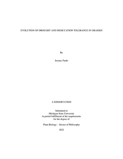 Grasses form the basis of our food system and are important ecologically as the dominant vegetation across wide swaths of land. The abiotic environment has influenced the evolutionary history of this amazing plant family. In particular, water availability is a challenge that has driven adaptation in grasses. Lack of water is also a major challenge for agriculture, both at present and forecasted to become more important in the coming decades. The research in this dissertation explores evolutionary adaptations of grasses to water stress using a comparative genomics framework. In each chapter of this dissertation we compare grass species, or groups of grass species, that differ in their water stress adaptations. Our goal is to identify genetic signatures that enable drought tolerance. We also look for shared responses that give us insight into the essential aspects of drought response that are conserved among diverse grasses. The four chapters in this dissertation look at three comparative systems. (1) We broadly compare two subfamilies of grasses: the Chloridoideae, which are a hub of plant resilience and contain a number of under-resourced crops, and the Panicoideae, which contain some of the world's most important crops but lack the resilience of the Chloridoideae. (2) We compare the desiccation tolerant extremophyte Eragrostis nindensis with its desiccation sensitive cereal crop relative E. tef. (3) We compare sorghum, a crop heralded for its drought resistance, with its more mesic cousin maize. Finally, in chapter four we return to the comparison of E. nindensis and E. tef but we add a new element of time as we look at desiccation tolerance through the lens of a high resolution timecourse.In our first system we conducted a literature review of the physiological, anatomical, and biochemical adaptations of grasses in the Chloridoideae and Panicoideae subfamilies. We focused on crop species within the two families with a focus on many under-resourced cereals. We put forward the hypothesis that panicoid and particularly chloridoid grasses which evolved in dry environments may hold the key to improving the resilience of major crops from more mesic environments. In our second system we looked at the origins of desiccation tolerance in grasses. A leading hypothesis suggests that the same genes which allow many seeds to survive dry conditions could help desiccation tolerant plants during extreme drought. We sequenced the genome of the desiccation tolerant grass E. nindensis and we compared how genes which are normally expressed in seeds behave in leaves during severe water stress in both E. nindensis and E. tef. We found that seed related genes are active in both species during severe stress. In our third system we used a novel machine learning approach to identify shared drought responses in the drought resistant crop sorghum and the more drought susceptible but related crop maize. Our approach found a core set of genes whose expression could predict whether a plant was drought stressed across species. These results suggest that elements of the drought response in grasses are more conserved than previously thought. Finally, we returned to our Eragrostis system but used a much higher resolution timecourse to see how gene expression changed over time. We found that E. nindensis shut down most of its metabolism during dehydration and genes which normally follow a 24 hour cycle of expression stopped cycling. These dramatic changes suggest that E. nindensis uses a pre-programmed orderly shutdown to survive desiccation.