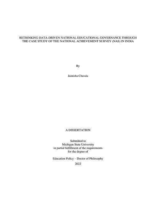 There is an emerging body of literature theorizing the role of data as a key instrument for national educational governance in a globalized and neoliberal world. These insights and theorization are predominantly derived from the experiences of Anglo-American countries with test-based accountability (TBA) policies. TBA policies hold schools accountable based on their performance in standardized tests. To expand the discussions on how data can serve as an instrument of national educational governance, in this dissertation I present an instrumental case study of the National Achievement Survey (NAS) in India. Using data from different types of policy literature and interviews with key officials, I argue that since 2017, NAS- a nationwide standardized assessment data collection effort in India is used both as an instrument to continue, promote, and support established bureaucratic governance practices (standard governance) and to introduce governance by cross-state comparisons to extend the central government's "soft power" (comparative governance). In this manner, I argue that NAS as an instrument of data-driven national educational governance differs significantly from the commonly understood models of test-based accountability in Anglo-American countries in its form, motivations, purposes, and possible implications. While the adoption of TBA models in Anglo-American countries has indicated a shift to a "post-bureaucratic governance" approach that more closely adheres to neo-liberal principles (see Maroy 2008; 2009; 2012), NAS continues to maintain the traditional bureaucratic approach. I explore the policy, organizational, and technical context which explains the rise and importance of NAS since 2017 in India. I trace India's education policy and data developments since the 1990s to show the clear demand for data like NAS 2017 in India. Once the demand gained credibility and urgency, I show how NAS 2017 emerged as the only feasible instrument to address this need owing to the Indian bureaucracy's technical capacity constraints at central and state levels. In absence of any alternative, NAS has been targeted for many purposes and towards many users. Lastly, I argue that the rising importance of NAS since 2017, reflected in how it is being employed, can be attributed to path dependency or its ability to enhance existing organizational practices without creating many disruptions. I call this the "new wine in an old bottle" approach. I discuss the key implications of understanding the NAS model for the literature on data-driven national educational governance. I also discuss how understanding India's experience with NAS illuminates the complexities of global education reform for developing countries and provides a distinctly different model of data-driven national educational governance compared to the TBA approach prevalent in Anglo-American countries.
