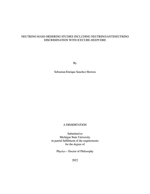 The observation of neutrino flavor oscillations by independent measurements of the Sudbury Neutrino Observatory (SNO) and the Super Kamiokande projects demonstrated the existence of neutrino masses, providing the first evidence of physics beyond the standard model (SM).To complete the picture of the neutrino oscillation formalism, one of the most important open questions is the ordering of the three neutrino mass eigenstates ?1, ?2 and ?3. After incredible efforts by solar, atmospheric and accelerator neutrino experiments, this problem is now reduced to a simpler question: whether the third mass state ?3 is above or below the other two. The former case corresponds to the so called normal ordering (NO) whereas the latter is called inverted ordering (IO). So far, there is not enough sensitivity to the neutrino mass ordering (NMO) to reach a definitive conclusion on this key oscillation parameter. Sensitivity to the NMO in atmospheric neutrino oscillation experiments arises from distinct matter effects in the oscillation probabilities for neutrinos in NO or antineutrinos in IO, after propagation through the matter profile of the Earth. The other two combinations: antineutrinos in NO and neutrinos in IO, present negligible matter effects in their oscillation profiles. The IceCube neutrino observatory has performed a measurement on this parameter using the DeepCore detector, with results that are consistent with both orderings. A main challenge for NMO measurements with atmospheric neutrinos in IceCube is that sensitivity to the NMO is maximal when comparing detector expectations for NO/IO to experimental data for clean samples of neutrinos or antineutrinos, but this separation is typically not possible for very large-scale Cherenkov detectors. However, sensitivity to the NMO is achieved through statistical differences in the total neutrino + antineutrino count rates in the detector between orderings, arising from differences in the cross sections and atmospheric fluxes for neutrinos and antineutrinos. This work presents a study of the neutrino mass ordering with DeepCore that aims to directly separate ?? and ̄ ??, thus incorporating the oscillation matter effects to full potential sensitivity. The novel algorithm developed leverages the difference in signatures of muon decay for ?? and ̄ ?? within the natural ice sheet. Within the sparsely instrumented DeepCore detector array, the ability to directly detect these low-energy signatures and identify the decay lifetimes was implemented. Dominant backgrounds in the DeepCore optical modules, including artifacts in the operation of the photomultiplier tubes (dark noise and afterpulsing) and the onboard electronics, were studied in detail and improved techniques, including improved models, to mitigate the effects were incorporated in the study. A boosted decision tree was trained to optimize the ??/ ̄ ?? separation power with the other key input parameter (neutrino energy, direction) of the mass ordering analysis, resulting in a modest improvement in the signature sensitivity (0.358+0.060−0.057? compared to 0.226+0.072−0.068?). A binary ensemble test utilizing 7.5 years of DeepCore data demonstrated a small preference for the “normal” neutrino mass ordering over the inverted case with p-values ?NO = 0.72 and ?IO = 0.17. The ??? value of the result, including the ??/ ̄ ?? separation parameter, is 0.61, consistent with both mass ordering scenarios. In the future, the fully developed analysis will be enhanced with data from the IceCube Upgrade which will incorporate an array design that will make it possible to enhance the detectability of the muon decay signature photons while significantly reducing the impact of internal optical module backgrounds.