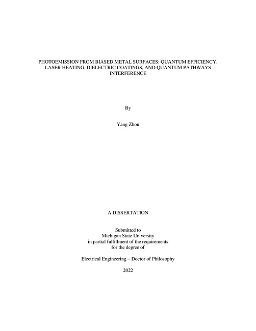 Electron emission from metal surfaces due to the illumination of laser fields is of great interest due to its broad applications ranging from electron sources to quantum information processing to attosecond physics. It also offers fundamental insights into electron dynamics and electronic band structures of materials. This thesis analytically studies the effects of laser (wavelength or frequency, and field strength) and cathode surface conditions (with or without dielectric coatings) on photoemission from biased metal surfaces, by exactly solving one-dimensional (1D) time-dependent Schrodinger equation. Our study provides better understanding of photoemission dynamics, laser heating effects on photoemission, and two-color laser coherent control of photoemission with a dc bias, and it is useful for the design of more stable and efficient emitters.First, we study photoemission from a metal surface using an analytical quantum model. It is found that shorter wavelength lasers can induce more photoemission from electron initial energy levels further below the Fermi level and, therefore, yield larger quantum efficiency (QE). The dc field increases QE, but it is found to have a greater impact on lasers with wavelengths close to the threshold (i.e., the corresponding photon energy is the same as the cathode work function) than on shorter wavelength lasers. When the laser field increases, QE increases with the laser field strength in the longer laser wavelength range due to the increased contributions from multiphoton absorption processes. The quantum model is compared with classical three-step model, the Fowler-DuBridge model, and the Monte Carlo simulation based on the three-step model. Even though those models have very different settings and assumptions, it is found that the scaling of QE of our quantum model agrees well with other models for low intensity laser fields.Next, we study photoemission from metal surfaces with laser wavelengths from 200 to 1200 nm (i.e., ultraviolet to near infrared). It is found that QE can be increased nonlinearly by the non-equilibrium electron heating produced by intense sub-picosecond laser pulses. This increase of QE due to laser heating is the strongest near laser wavelengths where the cathode work function is an integer multiple of the corresponding laser photon energy. The quantum model, with laser heating effects included, reproduces previous experimental results, which further validates our quantum model and the importance of laser heating.We then present an exact analytical theory for field emission from dielectric coated cathode surfaces, by solving the 1D Schrodinger equation with a double-triangular potential barrier introduced by the coating. The condition under which the emission current density from the coated cathode can be larger than the uncoated case is identified. Our quantum model is also compared with a modified Fowler-Nordheim equation for a double barrier, showing qualitatively good agreement.We further extend the exact quantum model for electron emission from metal surfaces coated with an ultrathin dielectric to photoemission. It is also found that a flat metal surface with a dielectric coating can photoemit a larger current density than the uncoated case when the dielectric has smaller relative permittivity and larger electron affinity. Resonant peaks in the photoemission probability and emission current are observed as a function of dielectric thickness or electron affinity due to the quantum interference of electron waves inside the dielectric. Our model is compared with the effective single-barrier quantum model and modified Fowler-Nordheim equation, for both 1D flat cathodes and pyramid-shaped nanoemitters. While the three models show quantitatively good agreement in the optical field tunneling regime, the present model may be used to give a more accurate evaluation of photoemission from coated emitters in the multiphoton absorption regime.Finally, we analyze the quantum pathways interference in two-color coherent control of photoemission using exact analytical solutions of the time-dependent Schrodinger equation. The theory includes all possible quantum pathways and their interference terms. It is found that increasing the intensity ratio of the second harmonic (2Ï⁹) laser to fundamental (Ï⁹) laser results in less contribution from the Ï⁹ pathway (absorption of Ï⁹ photons only) and more contribution from multicolor pathway (simultaneous absorption of both Ï⁹ and 2Ï⁹ photons) and 2Ï⁹ pathway (absorption of 2Ï⁹ photons only), and therefore stronger pathways interference and increased visibility larger than 95%. Increasing bias voltages shifts the dominant emission to processes with lower-order photon absorption, which sequentially decreases the interference between the Ï⁹ and the 2Ï⁹ pathways, and between single-color and multicolor pathways, leading to two peaks in the visibility as a function of dc field.