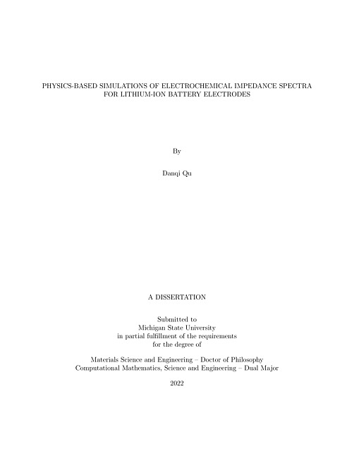 Electrochemical impedance spectroscopy (EIS) is a powerful and non-destructive characterization technique widely used in the electrochemical research field. It can measure many macroscopic properties such as internal resistance, capacitance, and diffusivity by fitting the obtained impedance with equivalent circuits. Each of the acquired quantities reflects an electrochemical mechanism, e.g, charge-transfer reaction, double layer formation, and mass transport, taking place in the electrode. However, the obtained quantity is a total value for the whole electrode. The underlying connections between the macroscopic properties, intrinsic material parameters, and electrode microstructures are not well understood. This dissertation focuses on building a modeling framework to simulate EIS processes with given electrode microstructures and intrinsic material parameters. With this simulation tool, we provide a digital bridge between battery electrode material properties, electrode microstructures, and their corresponding EIS impedance. Capacitance of an electrochemical device originates from double layer formation in the electrolyte. However, there is a huge spatial discrepancy between the dimensions of double layer and electrode particles (or interparticle space). Thus, smoothed boundary method and adaptive mesh refinement are used to handle the scale discrepancy and the complex geometries of electrode particles in solving the Nernst-Planck-Poisson equations in simulating the double layer formation under voltage loading.The obtained double-layer capacitance is incorporated into multiphysics electrochemical simulations. Cathode electrode made of Nickel-Manganese-Cobalt (NMC111) oxide, is examined with this simulation tool. As a solid solution material, lithium transport in the NMC111 electrode particles is described by Fick's law. EIS curves for various conditions, including different states of charge, electrolyte salt concentration, electrode microstructures, are extracted from the simulations and analyzed. The simulations properly reflect the relationships between particle exchange current density, reactive surface area, and the total resistance of the electrode.Anodes made of graphite, a phase-transforming material upon lithiation/delithiation, are also examined using the simulation tool. The Cahn-Hilliard equation is employed to model the phase transformation processes in the particles. EIS simulations are conducted on single-phase and multi-phase graphite. For single-phase or core-shell phase-distributed graphite particles, the simulated EIS curves exhibit a typical semicircle with a Warburg part. Interestingly, if phase boundaries intersect particle surfaces, a low frequency inductive loop appears on the EIS curve. Lastly, the simulation tool is applied to simulate EIS processes of a full-cell battery of both cathode and anode microstructures. On each electrode, the total current is comprised of capacitance and reaction currents. It is observed that, depending on the loading frequency, the ratio of capacitance-to-reaction current on the two electrodes can be significantly different. The simulation tool allows us to examine the details of electrochemical processes during EIS measurements.