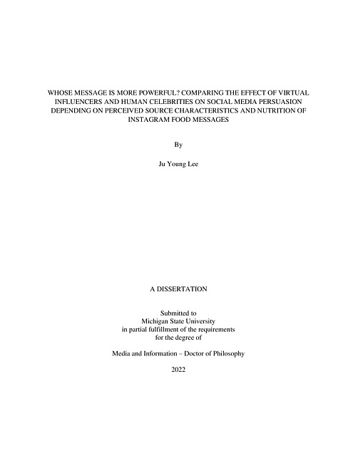 This study explores how endorser type affects attitudes and behavioral outcomes of social media users based on the Source Models, the dual processing model, and celebrity endorsement. The findings introduce a new type of social media endorser and propose a mechanism of virtual influencer endorsement compared with human celebrity endorsement. In detail, my research initially found that perceived source features mediate the association between endorser type (virtual influencer vs. human celebrity) and message persuasion (attitude toward the post, viral behavioral intention, and intention to consume the food in the post). For mediation models, the effects of human celebrities are more powerful with stronger perceptions of source attributions (trustworthiness, attractiveness, likeability, similarity, and parasocial interaction, but not expertise) than those of virtual influencers. Next, this research revealed a moderated mediation model showing that virtual influencer-endorsed Instagram posts generate a more favorable attitude toward the post depending on food type (energy-dense nutrient-poor foods vs. preferred foods) through likeability, but only for Instagram posts featuring energy-dense nutrient-poor foods (EDNP foods). Overall, the findings show that additional factors besides endorser type influence message elaboration and are the key elements to explain how virtual influencers form positive attitudes from target audiences with perceived source features in the dual processing model. This study provides theoretical contributions and practical implications by applying classical literature to a new media context.