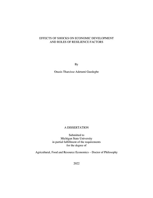 In recent decades, the inability to quickly cope with shocks and stressors became perhaps the most serious threats to growth and development, and a matter of concern among development stakeholders. As a result, they are now prioritizing resilience building at individual, household, and community levels. By providing up to date analysis on key missing gaps, this dissertation contributes to the literature explaining the nexus between shocks, resilience, and development, and informs the policy-making process about mitigation of various shocks and stressors. Departing from the usual practice of assessing the impacts of COVID-19 on development outcomes, the first essay investigates the effects of six policy responses to the COVID-19 pandemic on the farm and nonfarm incomes of agricultural households using Nigeria as a case study. The roles of endogenous policies such as lockdowns and stay at home orders have hitherto not been addressed in the literature. Essay 1 also examines the roles of factors that provide households with absorptive, adaptive, and transformative resilience capacities during unprecedented shocks. The results suggest that policies that tend to increase family labor availability were beneficial for agricultural households on the short run. In addition, the ability of agricultural households to withstand the adverse effects of the policy responses to the pandemic depends on their land size, wealth level, and degrees of income diversification, involvement in processing activities, and reliance on hired labor. These results suggest that policy responses to a health crisis, specifically containment measures, which are aimed at overall mitigation of adverse impacts, need to consider the impacts on farm viability. Since agriculture is crucial to livelihoods in developing countries, its role may be compromised if policies enacted do not consider the effects on the sector.For sub-Saharan African (SSA) countries, the second essay examines the short- and long-term effects of conflicts and droughts on agricultural growth and transformation trajectories using partial and total factor productivities measures as indicators of these processes. It also introduces an alternative approach to measuring resilience based on the timeframe in which the effects of a shock remain significant. The results suggest instantaneous and persistent disruptive effects of conflicts and droughts on the structure of agricultural production, which occur mainly through effects on quality and quantity of input use. Additionally, the overall structure of agricultural production is characterized by greater resilience to conflicts than droughts. By tying shocks to productivity, resilience and agricultural production in a temporal way, this study advances the literature in all three areas. Because productivity growth and agricultural transformation are cornerstone development strategies in SSA, these results are of high value to development stakeholders.In the third essay, the Nigerian experience with conflicts is used to study their short- and long-term effects on individuals' type of work (namely, family farm enterprises, family non-farm enterprises, and employment with others), and their effects on sectoral employment choices (namely, employment in agriculture, manufacturing, or services). For this purpose, the Nigerian General Household Survey is spatially joined with data on the location of conflict events and their associated number of fatalities. The findings provide evidence of significant labor reallocation effects of conflicts, which arise from the abandonment of farm activities and their replacement by employment in non-agricultural sectors. These effects are observed in both planting and harvesting seasons, suggesting that disruptions occur in both input- and output-related supply chains. Additionally, they differ across gender and skill levels. Hence, in addition to addressing the root causes of conflicts, improving access to education and labor market may be key ingredients of resilience building strategies.