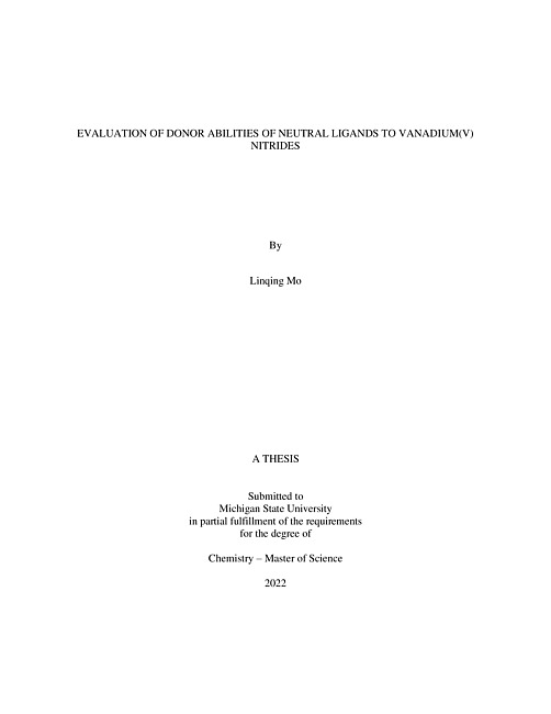 In catalyst design, the ancillary ligands play a crucial role in tuning the steric and electronic structure of the system and catalyst performance. Among those ancillary ligands, neutral ligands like phosphines (PR3) or substituted pyridines are some of the most widely-used ligands in transition metal catalysis, making the study of the interaction between these ligands and the central metal necessary. While the interactions between phosphines and low oxidation state metals have been studied for decades, there are few studies concerning the interaction of those ligands with high oxidation state metals. For anionic ligands, our group has developed a new electronic parameter (Ligand Donor Parameter, LDP) using a chromium(IV) species. However, the exploration of neutral ligands with the same chromium species is not an effective method for measuring the neutral ligand donor ability. Computational studies of how neutral ligands will interact with high oxidation state metals will be presented in Chapter 2, in which a new vanadium(V) based model has been used. In Chapter 3, reactivity studies are described where we explored methods of preparing vanadium(V) complexes for donor ability measurements. These studies can give us a better understanding of neutral ligands' donor ability to the vanadium(V) metal center and extend our understanding of how these ligands interact to high oxidation state metals.