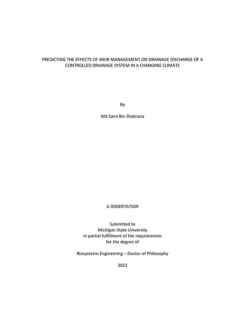 The widespread adoption of subsurface drainage in the Midwest United States coupled with fertile land and abundant rainfall has made this region the largest producer of corn and soybean in the nation. Although subsurface drainage helps reduce the waterlogging stress on crops by removing nutrient-enriched water from the field, it could contribute to harmful algal blooms in freshwater ecosystems. Controlled drainage (CD) practices can reduce the drainage volume leaving the field and have a positive effect on nutrient load reduction. Although the efficiency of CD under the present climate has been widely studied, it is essential to evaluate its performance in the future to build resilient agricultural systems. In this study, the efficiency of two CD practices was evaluated in reducing drainage discharge for the future based on the height and timing of the weir management. We used the Root Zone Water Quality Model (RZWQM2) to predict the CD management effects on drainage discharge. To obtain reliable simulation results from the RZWQM2 model, it is important to use measured soil-water characteristic parameters and flow data. We used HYPROP to measure the parameters of the soil water characteristic curve which served as input to the model. Additionally, we developed a stage-discharge equation for an AgriDrain metal-edge sharp-crest 45℗ʻ V-notch weir to accurately estimate the drainage discharge from the field. A reliable estimate of the drainage discharge was necessary to accurately estimate the nutrient loss.The recently developed P module of the RZWQM2, known as RZWQM2-P was used in this study to predict drainage discharge and P loss from a subsurface-drained field with clay loam soil. We used the Nash-Sutcliffe model Efficiency (NSE) and percentage bias (PBIAS) statistics to evaluate model performance. While the model showed "good" and "satisfactory" performance in predicting drainage discharge and total phosphorus (TP) load, respectively, it performed unsatisfactorily in predicting the dissolved reactive phosphorus (DRP) load for both calibration and validation periods. The underperformance of the model in simulating DRP load may be due to the inability of the model to partition fertilizer P into different P pools.We predicted the efficiency of two CD management scenarios (i.e., common and aggressive management) in reducing drainage discharge for future climate using the calibrated RZWQM2 model. The CD management scenarios were performed by maintaining the weir height at a higher (i.e., 15 cm for non-growing season and 40 cm for growing season) or lower (i.e., 30 cm for non-growing season or 50 cm for growing season) level inside a control structure and by altering the timing of the CD management based on the planting and harvesting dates. While both common and aggressive management was efficient in reducing drainage discharge for both historic and future periods, the percent reduction of drainage discharge with aggressive management was about 11% higher than the common management. The projected increase in precipitation and temperature in the future would cause increased drainage discharge during fall and winter. The aggressive management will be able to completely restrict the flow during the non-growing season which would reduce the nutrient loss of the surface water bodies. In the future, farmers should plant early to benefit from the projected increase in spring rainfall and avoid dry summers. In conclusion, it is evident from the results of this study that both common and aggressive CD management will continue to be effective in reducing drainage discharge in a changing climate.