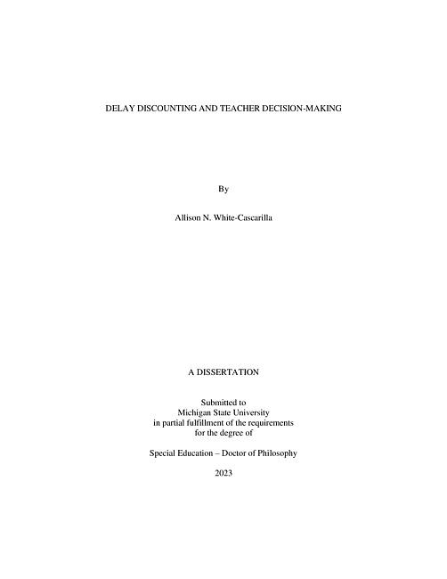 The purpose of this dissertation was to use delay discounting to understand how teachers of students who engage in challenging behavior discount delays in behavioral treatment outcomes. Delay discounting is relevant to teacher decision-making because the length of time required to reduce challenging behavior through effective behavior interventions may deter teachers from adhering to recommended behavioral interventions. Further, discount rates may serve as an indicator of future treatment adherence (or non-adherence). The goal of the dissertation is to inform the behavioral consultation practices of behavior specialists working with teachers of students who engage in challenging behavior in order to improve the outcomes of students receiving behavioral support through the behavioral consultation model. Chapter 2 addressed limitations to a previous delay discounting (White et al., 2023). Using the monetary choice questionnaire (MCQ; Kirby et al., 1999), the researchers reduced the length of the delay discounting task, assessed monetary and treatment discounting, and recruited 317 participants to increase statistical power to run additional inferential statistics. In the study, the authors administered the MCQ to assess discounting of monetary rewards and a treatment choice questionnaire (TCQ) modeled from the MCQ to assess discount rates of treatment outcomes. Results of the study indicate that teachers discounted monetary rewards similar to discounting of treatment outcomes. A significant difference between location groups in the low discounting group indicated that respondents that teach in the southern region of the U.S. had higher discount rates compared to remaining U.S. regions. Additionally, the authors created a 10-step fraudulent response detection process to remove any fraudulent reposes from the data set. Chapter 3 extended the findings of Chapter 2 by determining if a specific variable – severity of behavior – impacted teachers’ rate of discounting. The authors administered two TCQs to assess behavior severity as a state influence. One TCQ evaluated discounting of treatment outcomes for hypothetical severe challenging behavior, and the other TCQ evaluated discounting of treatment outcomes for hypothetical mild challenging behavior. Further, the authors replicated and extended the fraudulent response detection process described in Chapter 2. Results of the study indicate that teachers did discount delays to both monetary outcomes and treatment outcomes, and teachers did have higher discount rates in the severe TCQ compared to the mild TCQ. Additionally, extending the fraudulent response detection process guarded against fraudulent responses, and the inclusion of attention check questions aided in identifying fraudulent responses. Chapter 4 presents readers with a delay discounting tutorial. The authors (1) described translational research, delay discounting, and teacher decision-making, (2) provided researchers with a step-by-step description on how to collect delay discounting data using survey research methodology and fraud protections, and (3) described areas for future research using delay discounting to examine teacher decision-making.