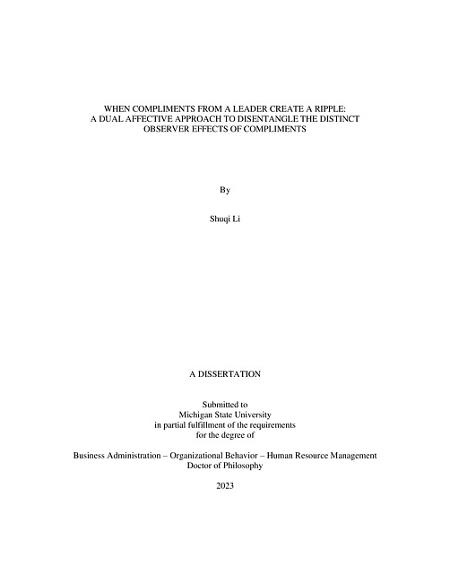 Compliments—voluntary and impromptu expressions of acknowledgement, approval, or praise of another’s accomplishments or behaviors—are a powerful tool leaders can use to enhance employees’ development, work engagement, and job performance. Although the positive effects of compliments on recipients’ well-being and performance are well-demonstrated, it is important to consider how leader compliments influence the broader audience (i.e., employees who witness compliments but are not the recipients). In this dissertation, I draw on social comparison theory and expectancy theory to suggest that leader compliments can both positively and negatively influence observers through the emotional experiences of inspiration and envy, respectively. Importantly, I identify observer expectancy (shaped by core self-evaluation, perceived similarity, and organizational support as individual, interpersonal, and organizational factors) and instrumentality (shaped by non-zero-sum mentality, relative leader-member exchange, and procedural justice as individual, interpersonal, and organizational factors) as two overarching boundary conditions that determine the degree to which inspiration and envy occur. Furthermore, while inspiration leads to a moving-up tendency to increase one’s own in-role and extra-role behaviors, envy leads to a pulling-down tendency aimed at harming the complimented coworker. By examining the ripple effect of leader compliments, I expand the social functions of compliments beyond the dyadic level and provide a more holistic understanding of compliments in the workplace.