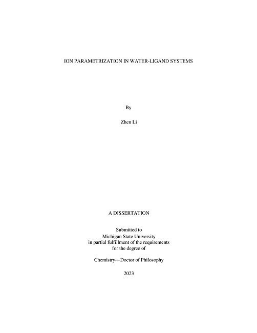 Metal ion–water–ligand interactions play myriad roles in biochemical, pharmaceutical, and medical sciences. For example, over 27% of all proteins have more than one metal binding site, according to the known PDB data up to the end of 2022. Because force field models are built on Newtonian mechanics and dynamics, they offer fast and detailed ways to simulate, analyze and visualize chemical processes at the level of atoms. The accuracy and transferability of force field models can be further improved using suitable Molecular Dynamics protocols or data analysis workflows. Nonetheless, the most significant challenge that force field models face is related to metal ions, specifically, simulating metal ion–ligand interactions in water or more complex systems such as metalloproteins. Various force field models have been developed and are in high demand. These force field models include the bonded, nonbonded, bonded non-bonded hybrid models featuring cationic dummy atoms and polarizable models featuring Drude oscillators with fluctuating charges. In the past six years, the work covered by this dissertation was mainly focused on providing parameters and improving the performance of the nonbonded models, which are the most widely used force field models. First, it was discovered that the traditional 12-6 Lennard - Jones model has limited accuracy when describing metal ion–water systems. This makes it hard to reproduce different experimental properties simultaneously. Based on the physical origins of the 12-6 model, an augmented nonbonded model, named the 12-6-4 LJ-type nonbonded model, has been previously proposed. However, this 12-6-4 LJ-type nonbonded model was not compatible with various new water models, like OPC3, OPC, TIP3P-FB and TIP4P-FB. Therefore, 60 different ions (including 8 monovalent cations, 4 monovalent anions, 24 divalent cations, 18 trivalent cations, and 6 tetravalent cations) were re-parametrized for the four new water models to expand the compatibility of this 12-6-4 LJ-type nonbonded model with the new water models. Further testing on these parameters proved that the 12-6-4 model could simultaneously reproduce hydration-free energies and ion-oxygen distances with high confidence levels. Second, the parameters obtained were used in the investigation of ion diffusion and ligand exchange in water. Fifteen ions (3 monovalent anions, 4 monovalent cations, 5 divalent cations, and 3 trivalent cations) had their diffusion coefficients calculated in OPC3, OPC, TIP3P-FB, and TIP4P-FB water models using an automated workflow ISAIAH (Ion Simulation using AMBER for dIffusion Action when Hydrated). A total of 60 simulated diffusion coefficients were obtained, with values within ±20% of the experimental values. Third, a pure programming contribution was needed by the AMBER molecular dynamics software package community. To improve the user-friendliness of implementing parameters for the 12-6-4 nonbonded model, modifications of the AMBER22 source code were conducted. These modifications allow users to add 12-6-4 potentials not only between two designated atom types but also between two single designated atoms, leading to specific interactions. Fourth, with proper computational support from the AMBER source code about the atom-specific pairwise potentials, the 12-6-4 potentials were then transferred to ligand (imidazole and acetate) systems. To guarantee the accuracy of ion-ligand-water simulation, the polarizability of ligating atoms was further parametrized to keep both ion-water and ion-ligand interactions consistent with the experiment. Fifth, the parameters designed for the ion-ligand-water system are applied to two protein systems. The first is an artificial protein TriCyt3 (PDB ID: 6WZC), which is used to test the robustness of the parametrization process for a protein that is totally unknown in evolution or homology models. The second is a membrane protein hZIP8 (PDB ID: 5TSA with a slight homology modification), which is used to test the transferability of these parameters in a complex environment that contains water, lipid, and protein with a variety of dielectric constants in the background.