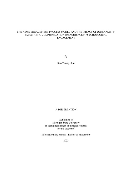 Audience metrics and other quantitative measures are limited in their ability to record and represent the scope and richness of news engagement ideals and practices in journalism. By looking into psychological and behavioral aspects of news engagement, this dissertation work aims to capture the complexity of news engagement. Particularly, this study proposes a news engagement process model that summarizes the mechanisms by which audiences and journalists engage with one other, with the intention of providing a framework that guides scholars to test relationships between journalists’ engagement practices and subsequent audience engagement. The news engagement model consisting of three core constructs—journalists’ behavioral engagement, audiences’ psychological engagement, and audiences’ behavioral engagement—is rooted in the assumption the news engagement process is a reciprocal interaction between journalists and audiences. Based on the proposed model, this study tested one proposition from the model: the effects of journalists’ empathetic communication behaviors (i.e., journalists’ behavioral engagement) on audiences’ psychological engagement. Emotionality, as opposed to historically detached practices in journalism, is considered to be an approach to enrich audience and journalist relationships. An online experiment with 338 respondents (2 X 3 factorial, between subjects) was conducted to test the impact of journalists’ empathetic communication in radio news stories, each describing a catastrophic event, on audiences’ psychological engagement. Audiences’ psychological engagement was measured using the following variables: sadness, journalist identification, interviewee identification, cognitive involvement (attention, recognition, and elaboration), and transportation. Relevance and novelty were predicted to moderate the main effects between the reporter’s empathetic reporting and audiences’ psychological engagement. Results of the experiment indicated that the radio journalist’s empathetic communication did not have a significant impact on audiences’ psychological engagement. In addition, neither relevance nor novelty had a significant interaction effect. In ad-hoc analyses that were based only on the responses of regular radio news listeners, the journalist’s empathetic reporting was instead negatively related to respondents’ feeling sad and recognition (against the predictions). These non-significant and contradictory results may suggest—despite the scholarly push for empathetic communication among journalists —that audiences may not respond or respond negatively to expressions of empathy by professional journalists in broadcast news stories. Implications and directions for further research are presented, emphasizing the need for detailed investigation of the contexts in which journalists should adopt perspective-taking in journalism practice.
