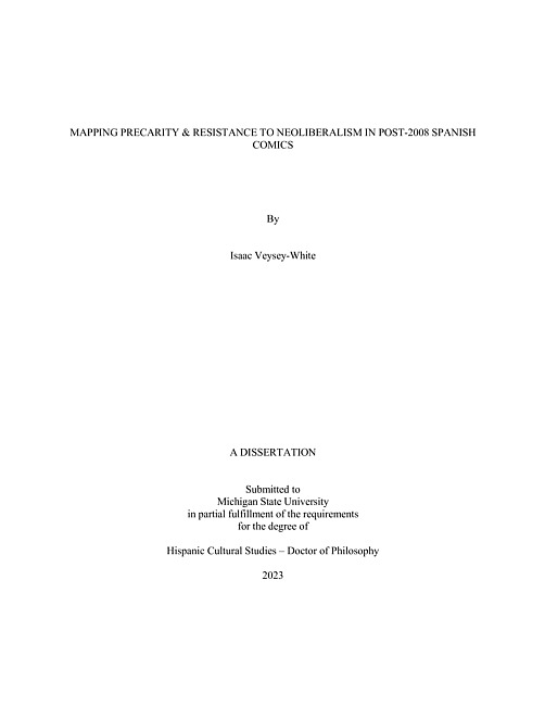 Spanish peninsular literature and popular culture has increasingly focused on the 2008 global economic crisis as a primary focal point over the past decade, and the neoliberal economic and political policies that enabled it. This recession left a lasting mark, relegating citizens to precarity and alienation because of job insecurity and financial instability. Literary and cultural production have risen to critique neoliberalism and the 2008 economic crisis in Spain, and prior scholarship has engaged with this body of work extensively. Olga Bezhanova’s work Literature of Crisis: Spain’s Engagement with Liquid Capital, for example, analyzes the ways in which the eponymous body of literature critiques Spanish neoliberalism in the novel, essay, and poetry formats. More work is needed, however, in understanding the role that comics play in this social criticism, due to their unique ability to utilize cartooning to make difficult concepts more approachable to their reader. While work has been done in this field, a comprehensive and in-depth study of comics of the crisis is needed to advance the field further. This dissertation intervenes at this critical juncture. Engaging with scholars of neoliberalism and the economic crisis, most notably Wendy Brown and Guy Standing, as well as Scott McCloud’s and Nick Sousanis’ approaches to understanding comics, this dissertation analyzes the unique ways in which comics engage with the crisis. These comics are not only informed by the crisis and cycles of protest in Spain, but can also serve as a tool for the reader to map their own positionality within neoliberalism in Spain and, perhaps, visualize solutions to their alienation. Through comics, we can gain a more robust understanding of this crucial moment in contemporary Spanish history.