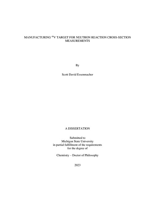 Many areas in nuclear science utilize simulation models of neutron reaction networks to predict the outcomes of chaotic events, such as stellar nucleosynthesis and nuclear detonations. The fidelity of these predictions can be improved by obtaining accurate nuclear reaction cross-section data. Much of the cross-section data on radioactive nuclei has not been measured before and performing these measurements would be beneficial for end users of evaluated nuclear data. Obtaining accurate nuclear reaction measurements of 48V, a radioisotope of V (t1/2 = 15.974(3) days), would be advantageous for the United States Stockpile Stewardship program as that data can enhance the fidelity of simulation models on neutron reaction networks and ultimately lead to better validation of the United States nuclear stockpile.Although there are many different types of nuclear reactions that can occur, the two reactions that dominate the destruction pathway for 48V with low energy neutrons are the 48V(n, γ)49V and 48V(n, p)49V reactions. Measuring total cross-section for the 48V(n, γ)49V reaction can be accomplished using the activation method, while a direct measurement technique that allows for the detection of outgoing protons and neutron energy (via neutron time-of-flight measurements) would be the best method for determining the 48V(n, p)49V cross-section. Both techniques require the fabrication of a stationary 48V target (containing mCi quantities of 48V) that meets specific purity, geometric, and stability requirements. In general, these targets need to be physically stable during the irradiation, free of impurities that would be detrimental for the measurement, uniform, and of the appropriate thickness to allow for accurate measurements to be made. The most important requirement for the target being measured via the activation method is the isotopic purity of the 48V, specifically with respect to 49V (>104 atoms of 48V/atom of 49V), while the 48V target for direct neutron-induced charged particle reaction measurements must be thin and uniform to minimize the attenuation of outgoing protons and the measurement time and error. To produce 48V in high isotopic purity and manufacture a thin and uniform 48V target, an isotope production method and a target fabrication method must be identified. Two different isotope production methods were investigated to discern the best method for producing 48V in high isotopic purity relative to 49V: a conventional α irradiation of natural Sc foil method and a novel method called isotope harvesting that focused on harvesting 48Cr from the aqueous beam dump at the Facility for Rare Isotope Beams and setting up a 48Cr/48V generator for pure 48V production. Isotope harvesting was found to be the best method for producing mCi quantities of 48V that meet or exceed the purity requirements for a 48V target to be used in neutron activation studies. Meanwhile, two 48V target manufacturing techniques were also examined: a conventional electrodeposition technique and a novel method called microjet printing. The electrodeposition method was found to be extremely pH dependent and would be challenging to use to produce a radioactive target, while microjet printing has the highest potential at being the most effective method for fabricating thin and relatively uniform 48V targets. Overall, a recommended thin 48V target manufacturing protocol was identified and covers all the steps from the in the process to produce mCi levels of 48V in high isotopic purity relative to 49V along with those necessary for the fabrication of a thin and uniform 48V target for neutron-induced reaction studies.