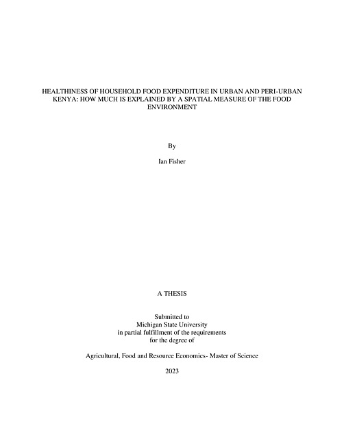 Both the Kenyan government and international development organizations have labeled problems of food access and availability a pressing policy issue. Due to many rapidly changing forces such as the nutrition transition, urbanization, and food systems change, consumers in low-income settings face a plethora of food purchasing choices, in terms of what to buy and where to buy it. These choices reveal themselves in the food expenditure behavior of consumers in response to their rapidly changing food environment (FE). People rely more on markets now than on own production, and thus food is becoming more purchased and processed to varying degrees of healthiness (Kenya National Food and Nutrition Security Policy 2011). Based on these themes and using a cross-section dataset from household-level and food environment surveys, food expenditure data is regressed against a proximity-to-outlet measure for various outlet types. The main result of this paper is estimated distance elasticities that measure the responsiveness of household’s food shopping expenditure to variations in distances to different types of food outlets. The results generally show that household’s location characteristic matters more than household’s average distance to outlets when it comes to predicting healthiness of food purchase. The paper also finds heterogeneity in these distance elasticities by characteristics such as main shopper age as well as household poverty probability and location. This research contributes a new application of the distance elasticity concept previously featured in international trade literature. It motivates future studies on food environment metrics within urban and peri-urban settings of low- and middle-income countries (LMICs) to better understand what drives food shopping behavior and how to increase food expenditures toward more healthy food options.