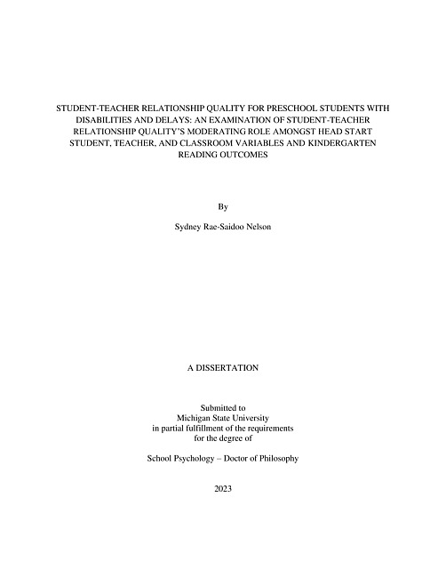 Student-teacher relationship quality for preschool students with disabilities and delays : an examination of student-teacher relationship quality's moderating role amongst head start student, teacher, and classroom variables and kindergarten reading ou...