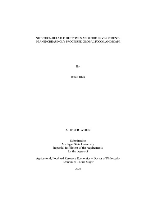 Globalization and modern food production, processing, and marketing techniques have increased access to food in many regions in the world, reducing food insecurity. However, there are some serious consequences that have, until recently, been largely ignored in many developing countries. Some methods of food processing have produced foods with high caloric density, but minimal nutrient content. This has manifested as decreasing rates of various forms of undernutrition yet increasing overweight and obesity. Policy and program efforts by governments and NGOs try to find simple solutions, but are often created with only partial understanding of these complex issues.It may be too difficult due to resource constraints to acquire full information about various nutrition-related problems. One must possess knowledge of consumer behavior, the impacts various choices might have on health, and how external drivers influence the consumer and their food environment. Obtaining this information is further complicated by the rapid transitions in developing countries. Diets are becoming increasingly processed, and daily habits are trending towards more sedentary activities. At the same time, incomes are rising, food insecurity is falling, and poverty is declining in general. There is much need to understand these complex issues to better assist designers of policy and programs to provide the greatest benefit while mitigating negative unintended consequences.℗ This dissertation examines three nutrition- and nutrition-related issues. A variety of econometric techniques are applied to secondary data to explore processed food consumption, consumer shopping behavior, and the relationship between nutrition outcomes and processed food imports. This work contributes to the literature by providing a better understanding of the impact of processed food consumption on overweight or obesity, mechanisms that might drive rapid℗ obesity increases, and how the food purchasing behavior of low-income households impacts the cost of their diet.In the first paper, we examine the complex relationship between activity, diet, and the likelihood of adults being overweight or obese using a three-round nationally representative panel data set from Tanzania and a correlated random effects probit model to account for unobserved heterogeneity. Our results suggest large differences in the effects of diet and activity choice between rural and urban areas.In the second paper, we explore the existence of a two-way linkage between trade and health that has long been discussed, but never investigated empirically. Processed food imports are usually accompanied by robust marketing campaigns, which suggests there might be induced socio-cultural changes that may drive increased processed food importation. The socio-cultural changes may not be directly observable but should manifest in increased rates of overweight or obesity. Our evidence suggests a two-way relationship might exist, which is a serious concern for developing countries where exposure to ultra-processed food to date is below that of developed nations but is rising rapidly.In the third paper, we examine whether shopping behavior impacts food prices households pay. We develop a model of prices consumers face that accounts for two dimensions of food procurement: spatiality of shopping behavior and frequency of shopping trips. We explore this issue using a recent survey conducted by MSU in low-income areas of Nairobi, Kenya. Our results suggest two prominent points. First, households seem to perform very well controlling the cost of their food basket given their likely time, budget, and information constraints. Second, while we find substantial spatial price differences, we do not find any significant price benefit to those that shop outside of their local food environment.
