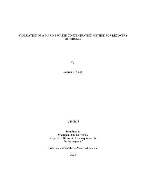 The goal of this project was to develop simple and rapid methods for virus detection in water to aid US marine mammal program veterinarians in caring for bottlenose dolphins (Tursiops truncates) and California sea lions (Zalophus californianus). These marine mammals need to be protected from viral diseases while they stay in a netted enclosure in San Diego Bay, California. The purpose of this study was to evaluate the Innovaprep Concentrating Pipette Select (CP Select) for the rapid concentration of viruses in environmental water samples. Bacteriophages MS2, P22, Phi6, and PhiX-174 were seeded in artificial seawater and tested for recovery after using the CP Select. These bacteriophages vary in characteristics and were selected to be surrogates for animal viruses (e.g., Levivirdae, Podoviridae, Cystoviridae, and Microviridae). Recovery for all bacteriophages was evaluated either using a plaque assay and/or Droplet Digital PCR (ddPCR). After a method was established using phages, three animal viruses: adenovirus (Adenoviridae), coronavirus OC43 (Coronaviridae), and morbillivirus canine distemper virus (CDV, Paramyxovirus) were included in this study using artificial seawater as well as water from the John Shedd Aquarium and San Diego Bay. These animal viruses were quantified using ddPCR. The culture assay average recovery for each phage was: 82.73 ℗ł27.3% for P22 (n=6), 4.84 ℗ł3.8% for MS2 (n=3), 32.77 ℗ł19.3% for PhiX174 (n=6), and 71.48 ℗ł42.5% for Phi6 (n=6). The ddPCR assay average recovery was 7.82 ℗ł8.1% for MS2 (n=3), 34.72 ℗ł19.7% for Phi6 (n=6), 39.31 ℗ł26.6% for Adenovirus (n=9), 19.04 ℗ł11.6% for OC43 (n=9), and 19.84 ℗ł13.6% for CDV (n=9). In the future, this method will be shared with the US marine mammal program so that they may implement surveillance in their netted enclosure. This method could also be implemented in aquaria or at public beaches for water quality testing.℗