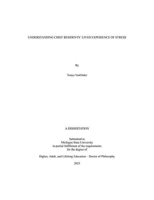 High rates of physician stress, burnout, and suicide have prompted a reinvigorated focus on research related to understanding the causes and potential interventions. Despite widespread efforts to improve physician and medical trainee well-being, little has changed. The goal of this study was to explore how chief residents (CRs) understand and experience stress to provide a better understanding of the true impact it has on their relationships with self and others. Using a phenomenological study design approach, I conducted in-depth interviews with four CRs from four different specialty disciplines at a single general teaching hospital. A conversational interview format allowed participants to share stories in their own ways without steering them in specific directions. As a result of the interviews, three primary themes emerged relating CR stressful experiences to a high need for autonomy, strong feelings of inadequacy and guilt, and feeling the need to keep personal struggles hidden. The ways the themes characterized the CR experiences supported some well-established theories about adult learners (need for autonomy) and learners' experiences in clinical environments (culture of silence about expressing emotions). In other ways, my study findings complicated existing literature and pointed toward a need for future studies in new directions. Although there may be ways to reduce some stressors experienced by physicians, the themes from my study highlighted a broader truth about the nature of the profession. Taking care of the sickest in society is emotionally-laden work that does not fit neatly into defined hours or days. There is no way to make the nature of health care work less stressful. When combined with the rapid pace of technological change, evolving consumerism of healthcare, and increased administrative burden on physicians, what is being expected is at odds. The best we can do is honor doctors, listen, acknowledge their gift to society's well-being, and support their individual needs along the way.