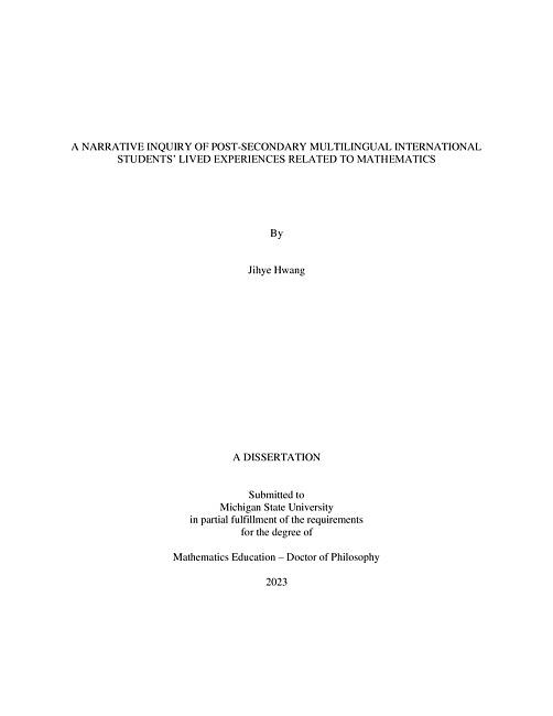 The number of multilingual international students in post-secondary mathematics classrooms in the United States is increasing. As language is related to students' access to mathematics learning and their (mathematics) identities, it shapes their experiences as a doer of mathematics. However, as multilingual international students move to the United States, they routinely experience a change in the language of instruction, which influences their position as mathematics doers. Yet very little is known about their experiences in their current post-secondary mathematics classrooms and who they are. The purpose of this study is to understand their lived experiences that influenced their past, current, and future relationship to mathematics by using narrative inquiry. Through this study, I call for more attention to multilingual international students and further research about how to serve this growing population in post-secondary mathematics education. In this narrative inquiry, I worked with four post-secondary multilingual international mathematics students, Jia, Maria, Helena, and Jihyun (all pseudonyms), to study their mathematics identities and see how they leverage their languages in different contexts. Each of the participants' essays about their relationship to mathematics was collected first, and then there were an hour to 1.5-hour synchronous interviews with each of the participants. Asynchronous interviews were then conducted in a written form based on their essay and synchronous interviews. All the verbal data were transcribed and analyzed to create a narrative for each participant using narrative analysis. All four participants came from different countries. Jia shared her challenges in undergraduate mathematics courses, especially in a groupwork-based course. She also shared how she used her first language and English in different contexts. Although Maria shared some thoughts about being multilingual, she focused more on her experiences of being a woman in mathematics and the social challenges as an international student. Helena shared how her first language, Spanish, is intricate to how she sees her world. Her narrative raises questions about the perceived hierarchies of languages in mathematics. Lastly, Jihyun shared cultural and linguistic differences that she noticed as she moved to the United States. Her case shows how different stereotypes about gender and race intersectionally shape her actions. Across the four participants' experiences, three main themes were found: 1) the participant's understanding of the roles of language in mathematics and how they use their languages in doing mathematics; 2) some participants' understanding of how race and nationality shape their actions, and 3) the participants' marginalized experiences because of their gender and their reaction to such a stereotype. Further, how intersections of these multiple social identities can influence participants' actions℗Ơ was explained using the case of Jihyun, a Korean woman. This work contributes to the documentation of post-secondary multilingual international students' experiences in the United States and their identities from their past experiences, which were rarely focused on in existing literature on post-secondary mathematics education. Even though the mathematics education field as a research area has tried to escape the deficit perspective toward multilingual students, some participants were still attributing their challenges to some internal deficit they perceived. Changing of the narrative in the education field and providing a better learning environment for them where their languages are more valued would be necessary.