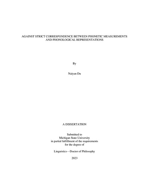 As observed in different subfields of psychology, the relationship between knowledge and performance is rather remote. Similarly, in linguistics, there is no guarantee about the correspondence between phonetic measurements and phonological representations. There are multiple interacting sources that affect speech production, e.g. lexical knowledge, phonological knowledge, memory and processing constraints, etc. Consequently, phonetic manifestations cannot automatically or solely be used as a diagnostic of any phonological representations. However, in previous literature, the strict correspondence between phonetic distributions and phonological representations is often explicitly or implicitly assumed. In this dissertation, I will argue using data from Huai'an Mandarin that non-linguistic performance factors can have significant influence on phonetic manifestations in unexpected directions. To be more specific, I will present production data from Huai'an Mandarin to make three points. First, I will show a case of phonologically complete neutralization that results in phonetically incompleteness with a large effect size. Second, I will show a case of phonetically complete neutralization that results in phonological behavioral differences. Third, I will show a case where optional phonological processes lead to more phonetic incompleteness.For the first point, I will show in Huai'an Mandarin that derived Tone 3s from Tone 1 or Tone 4 sandhis are phonetically very different from underlying Tone 3 that did not undergo any phonological processes. The Tone 3 category of derived Tone 3 is established by the previous description that only Tone 3 can trigger Tone 3 sandhi in Huai'an Mandarin. Since both derived Tone 3 from Tone 1/Tone 4 sandhis and underlying Tone 3 can trigger Tone 3 sandhi, derived Tone 3 should be phonologically identical with underlying Tone 3. For the second point, I will use evidence also from Huai'an Mandarin arguing that two Tone 3s derived at the lexical and the post-lexical levels have different phonological behaviors despite that they are arguably phonetically identical. The phonological behavior difference in this case is indicated by different rates of the two derived Tone 3s triggering another Tone 3 process. Despite being arguably phonologically different, the described derived Tone 3s are indistinguishable in all major phonetic cues including f0, duration and intensity. For the third point, I will show in Huai'an Mandarin that only optional phonological processes (Tone 1/Tone 4 sandhis) can have incomplete phonetic neutralization with a rather large effect size, while mandatory phonological process (Tone 3 sandhi) in the same language can only have incomplete neutralization with a very small effect size.Overall, data from Huai'an Mandarin provide strong evidence for the gap between phonetic measurements and phonological representations. And phonetic measurements can only inform of phonological knowledge when accompanied by other evidence under certain circumstances.