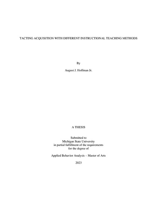 Tacting is a critical skill that all children are expected to be able to do. The verbal behavioral definition of a tact is a label of something you see, hear, smell, taste, or touch. The antecedent for a tact is some form of stimulus and the consequence for a tact is indirect reinforcement, such as praise (Barbera & Rasmussen, 2007). The ability to tact allows a child to increase their communication and social skills, allowing them to answer questions from adults and label items in their environment. Tacting will also allow a child to increase their vocabulary, while also allowing them to be able to express themselves better. A child can tell us about covert feelings they are having (e.g., being hungry, tired, in pain). Children with autism spectrum disorder often have difficulty tacting because social reinforcement (e.g., praise, smiling) may be ineffective (Bak et. al., 2021). Due to the potential for a child's ability to tact to impact their social relationships and communication skills, it is crucial for behavior technicians, who often provide services to children with autism spectrum disorder, to effectively teach this skill. This study will analyze and compare different instructional teaching methods in the effectiveness of teaching tacts to children with autism spectrum disorder. Teaching interventions will consider how the setting may affect mastery progress (discrete trial training vs naturalistic environment training) while also looking at the different teaching methods used in each of these settings. Hypothesis for this study is that interventions taught in a naturalistic developmental behavioral intervention (NDBI) setting will aid children with ASD in meeting mastery criteria for tacting more quickly, as opposed to a discrete trial setting.