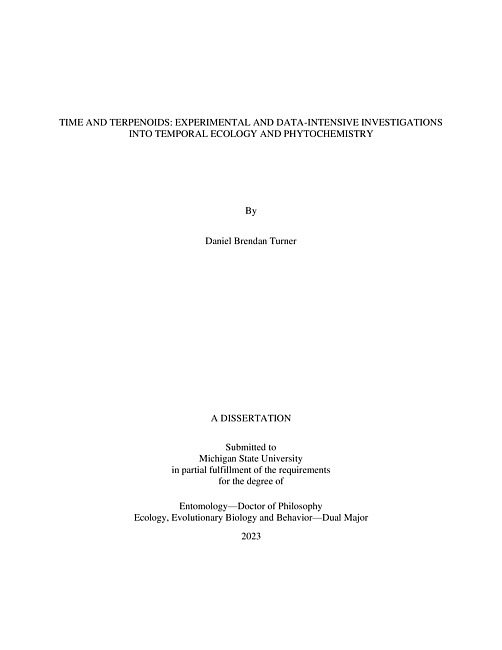 Time and terpenoids mediate interactions between plants and their environment. Time has increasingly been recognized as a source of variability in ecological interactions. Despite known temporal variability in natural systems, ecological experiments often evaluate treatment effects at a single moment or as the aggregation of many moments in a community. I hypothesize that both treatment timing (i.e., when we apply a change to a system) and observation timing (i.e., when we measure a response) will affect the responses measured in herbivory experiments. Studying the interactions between Solidago altissima and insects and pathogens in in situ and common garden experiments, I evaluate how the timing and frequency of herbivory, as well as the timing of observations, affects estimations of plant growth and community responses. Feeding by Slaterocoris sp. (Hemiptera: Miridae) variably impacted subsequent chewing herbivory, pathogen damage, and plant height; pathogen damage was generally reduced in miridfed plants until the final observation date, and plant height was reduced in mirid-fed plants at all observation dates. In a second experiment, I found that late-timed jasmonic acid sprays significantly reduced chewing herbivory damage at the first observation, but not ten days later. Multiple sprays had cumulative effects on pathogen susceptibility, depending on spray timing.℗ Terpenoids are the most diverse group of phytochemicals, yet identifying macro-scale trends in their diversity across environmental gradients and phylogeny has lagged due to limitations in cross-study synthesis and the logistical constraints of analyzing plant tissues at a global scale. Through a meta-analysis of studies on more than 200 plant species, I tested how terpenoid diversity varies across a gradient of two climate variables-mean annual temperature and annual precipitation-and if plant species that are more closely related produce more similar terpenoid profiles. I focused on two easily detectable superclasses of terpenoids, monoterpenoids℗ and sesquiterpenoids. Both compound richness and structural Îł-diversity increased with increasing annual precipitation. I also found that more different temperature and precipitation regimes are associated with increasingly distinct terpenoid profiles. These patterns may be explained by the physicochemical properties that govern terpenoid release from plant tissue, including stomatal conductance, but further mechanistic investigations are needed. More closely related species produced more similar terpenoid profiles but less similar chemical substructures than more distantly related species. These phylogenetic patterns may be explained by plants sharing evolutionary history that constrains the overall terpenoid profile. Closely related species may also differentiate themselves through chemical substructures that govern other organisms' structurally specific perception to compounds.℗ Assembling large, detailed trait databases is imperative for the advancement of testing macroecological and macroevolutionary hypotheses, and most plant trait databases are assembled around morphological and life history traits that can be measured readily across many plant species. Phytochemicals have gone largely overlooked in the generation of these databases because the methods for detection, identification, and reporting vary widely across investigators and focal groups of chemicals. To lay a foundation for the development of global, quantitative, and methodologically detailed phytochemical databases, I present terpr v1.0.0, a database of plant monoterpenoids and sesquiterpenoids from 1127 studies containing 5107 samples from 1178 plant species, constituting 1852 unique identified monoterpenoids and sesquiterpenoids. I collected 86 features, including table indices, for each study, and present the database for further investigation into the patterns of terpenoid diversity, identification of valuable natural products, and best methodological practices.