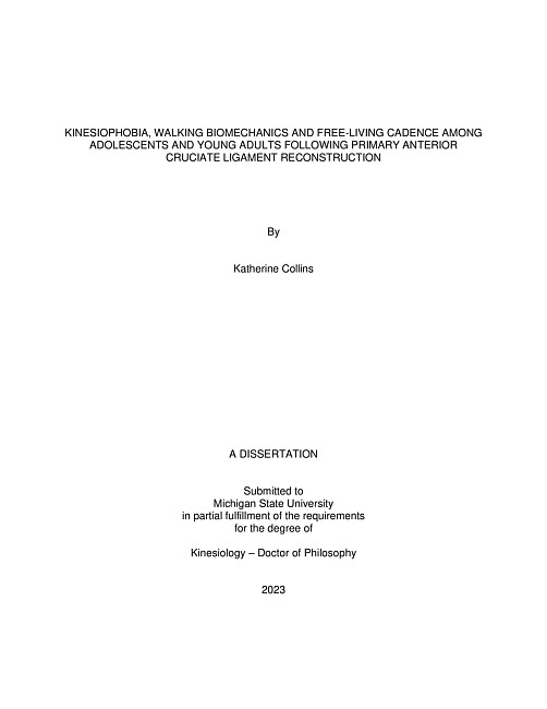 Individuals with history of primary anterior cruciate ligament reconstruction (ACLR) demonstrate aberrant walking biomechanics such as reduced vertical ground reaction forces (vGRFs) and slow gait speed. These mechanics are related to indicators of poor knee joint health as early as only 6 months post-operative and have also been implicated in the development of knee osteoarthritis (OA). Elevated kinesiophobia is also commonly reported following anterior cruciate ligament (ACL) injury and ACLR, and among individuals with knee OA. As a result, we chose to investigate the association between walking biomechanics, free-living cadence, and kinesiophobia following primary ACLR.In study 1, 65 participants underwent a walking biomechanics assessment to determine: 1) ACLR limb peak vGRF during the first 50% of stance, 2) Between-limb symmetry index for peak vGRF and 3) gait speed. Seventy-two percent of participants (47/65) were characterized as experiencing elevated injury-related fear 6 months following primary ACLR. Despite this prevalence of elevated injury-related fear, kinesiophobia was not significantly associated with ACLR limb first peak vGRF (P=0.634, F=0.230, Î₄R2=0.0021), first peak vGRF limb symmetry (P=0.589, F=0.295, Î₄R2=0.0048), or gait speed (P=0.856, F=0.0333, Î₄R2=.0005) among our sample. Our findings indicate that kinesiophobia may not have a significant influence on walking biomechanics early following surgery; perhaps other interventions such as real-time gait biofeedback may be more effective in addressing aberrant walking early following primary ACLR.℗ In study 2, 48 participants completed a laboratory and free-living assessment of walking characteristics. Laboratory-assessed gait speed was associated with peak 1- minute free-living cadence (r=0.444, P=0.002). ACLR peak vGRF was associated with℗ peak 1-minute free-living cadence (r=0.331, P=0.025). The findings of this study indicate a disconnect between average laboratory gait and average free-living gait. However, our results also suggest that participants who demonstrated faster walking speeds and greater ACLR limb peak vGRFs during their lab assessment also exhibited faster peak minute-level cadences in free-living conditions.℗ In study 3, 30 adolescents who were 6-9 months post primary, unilateral ACLR completed 1 week of free-living step count monitoring to determine average steps taken per day and cadence characteristics. Adolescents who reported elevated injury-related fear demonstrated slower mean light cadences (F=9.518, P=0.005, Îʺp 2=0.268) as compared to adolescents who reported acceptable injury-related fear. Management of elevated kinesiophobia 6-9 months following primary ACLR may provide an avenue to intervene on free-living light cadences among adolescents, with the goal of improving long-term knee joint and general health outcomes.