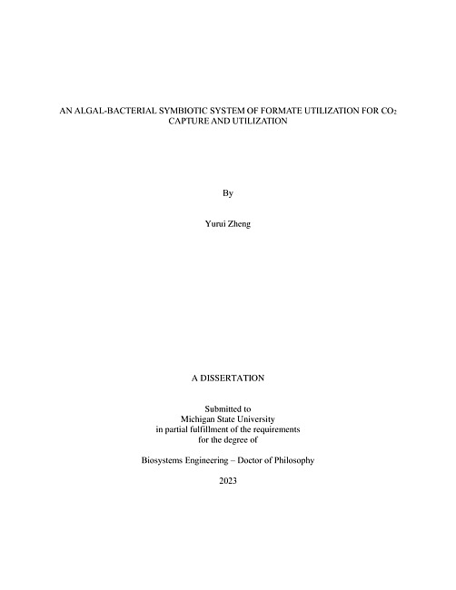 Microalgae is one type of photosynthetic microorganism which can utilize carbon dioxide (CO2) through photosynthesis and convert exogenous carbon into microalgal biomass. Microalgal cultivation is considered as one of promising ways for carbon capture to reduce greenhouse gas effects. Formate is known as a single-carbon chemical, which possesses good solubility and stability under a wide range of pH. This work represents a comprehensive examination of microalgal culture of the green microalgae Chlorella sorokiniana by utilizing formate and effects of formate on this symbiotic algal-bacterial system.In Chapter 2, an algal-bacterial symbiotic system was explored to investigate utilization of formate as a carbon source. The algal-bacterial assemblage, after a 400-day adaptive evolution using the formate medium, has demonstrated a new capability to assimilate both formate and CO2 to promote biomass production. 13C isotope tracing and microbial community analysis were conducted to indicate a uniquely evolved formate utilizing culture. This study demonstrates a new route of using electrochemical-derived formate to support mutualistic algae-bacteria biorefinery while the formate as an alternative carbon source could repel pests for outdoor algal cultivations.In Chapter 3, cultivation parameters including light intensity, formate feeding rate and a novel approach of alternating carbon feeding were tested for enhancing microalgal biomass and productivity during the culture. Effects of formate on microbial communities and algal assemblage were reported. The results showed that formate was a good carbon source for microalgal cultivation, and the highest biomass concentration of 1.4 g/L was achieved during the culture. Microbial community analysis revealed a stable microalgal-bacteria consortia under the formate feeding system. Microalgal biomass was further increased to 1.6 g/L compared to the℗ formate feeding method with the alternating carbon feeding method.℗ In Chapter 4, effects of formate as an additional carbon source for microalgal culture with pumping flue gas within a 100 L photobioreactor (PBR) were investigated. Results showed that formate addition group exhibited better carbon capture efficiency than group without formate addition. Mass and energy balance analysis showed that formate group required 20% less energy consumption and showed nearly 33% higher biomass yield on average compared to control group.In summary, this work presents a symbiotic algal-bacterial system of utilizing formate. The work establishes a stable microalgal cultivation method with formate feeding in both bench-scale and pilot-scale PBRs. Notably, this work advances carbon capture efficiency in microalgal cultivation field, as well as innovative methods and techniques that elucidate the viability of formate utilization in microalgal cultivation for carbon capture.℗