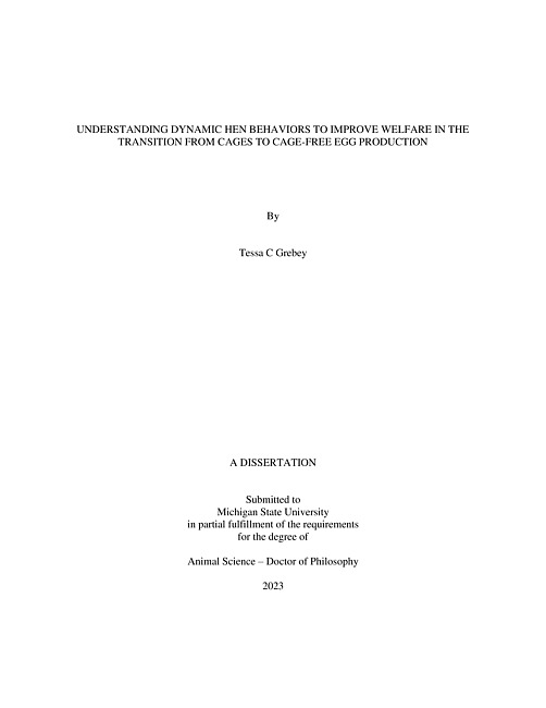 A global trend towards improving farm animal welfare has seen an increase in the use of alternative or cage-free housing systems, and several countries have implemented bans on caged egg production due to their barren nature. Individual states in the U.S. have also established cage-free regulations intending to improve hen welfare by providing more space and resources per hen than are possible in cages. Due to this legislative demand, along with pressure from corporate pledges to source only cage-free eggs within a short timeline, many egg producers are undergoing the costly transition to build, stock, and maintain cage-free production facilities. Hens housed in cage-free systems can move throughout their enclosures and can utilize resources like perches, litter areas, and designated nests. Unfortunately, the addition of these resources, along with increased freedom of movement for hens and interactions among conspecifics within the flock, have also had unintended consequences (including negative hen behaviors such as crowding/crushing one another and cannibalism, and hen behaviors that are undesirable to producers, like laying eggs outside of nest sites). Further, several space and resource guidelines are set on a per-hen basis and may not consider that certain hen behaviors require a varying amount of space, nor do they consider the potential influence of large portions of a flock behaving congruously (in both situations, the amount of space or resources allocated by guidelines may not be the actual amount that is used or needed by hens). As an additional consideration, many of hens' key behaviors are diurnal in nature and it is possible that synchronous flock movement to a certain resource at a certain time of day, coupled with management tactics used to curb undesired behaviors, could prevent hens from performing these behaviors based on their preferred temporal patterns. To better ensure that guidelines on cage-free husbandry and management practices actually improve hen welfare as intended, research should consider the influences of multiple factors on hen behavior. Therefore, the overarching℗ focus of this project was to examine how laying hens of different genetic strains perform dynamic and space-intensive behaviors in a multi-tiered aviary system. Behaviors chosen for examination were dust bathing and wing flapping, both of which have been deemed important by cage-free legislation. Commercial-style Natura60 aviaries were stocked with 4 genetic strains: Hy-Line Brown [HB], Bovan Brown [BB], DeKalb White [DW] and Hy-Line [W36]. In the first study, we found that white strains had higher rates of litter occupancy and more synchrony in dust bathing behavior compared to brown strains. White-feathered hens also had smaller interbird distances while performing a dust bathing bout, whereas hens of the brown strains had larger inter-bird distances and shortened the duration of dust bathing bouts in the presence of more hens on the litter or with less space between nearby hens. During initial placement in the aviaries, we saw a similar behavioral trend based on genetic strain: following a period of complete litter restriction, DW and W36 hens occupied litter in greater numbers and at a faster rate HB and BB hens. When doors to litter opened each day, hens not only gained access to litter but also to unfettered three-dimensional space. Hens of all 4 strains flapped their wings more in the first 85 minutes (11:35am-12:55pm) following doors' opening, suggesting their daily confinement within tiers may have influenced their motivation to wing flap once they had room to do so. While wing flapping, W36 hens required an average of 51.02 ℗ł 4.7 cm of vertical space; however, our hens were cage-reared and housed, and the manner in which they flapped may not be representative of hens with more muscle development and experience with wing flapping. The method we tested should be further utilized on dynamic behaviors on of hens from a variety of strains, ages, and backgrounds. Future work is needed to determine the space requirements of hens for particular resources rather than blanketed guidelines for space as a whole. Differences in social distancing, behavioral synchrony, and the time-of-day around specific resources need to be identified.