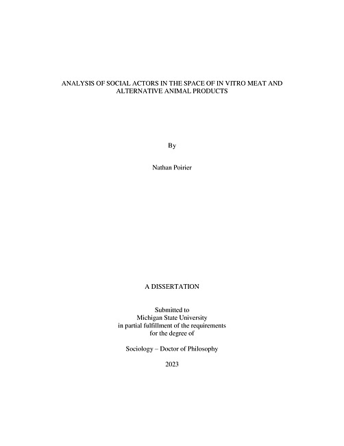 This dissertation empirically examines how multiple groups of social actors-activists, animal welfare scientists, and alternative animal product "industry" insiders-are reacting to and discussing emerging food items aimed at replacing traditional animal products, with a focus on cell-based meat (i.e., in vitro meat, or IVM for short). Each of the three papers in this dissertation focuses on one of these groups. Each paper also uses a different methodology that is unique and adapted to the type of data analyzed-content analysis, discourse analysis, and semi-structured interviews. The overarching goal is to assess what sorts of conversations are happening, by whom, and how these conversations might influence the emergence of alternative animal products and existing social structures. Taken together as a single study, this dissertation presents both the depth and breadth of the alternative animal product space. The basic arguments that stakeholders for and against alternative animal products are using, what types of questions they are asking, and the problems they are working to solve, are analyzed in detail.This dissertation finds that activist stances tend to be more black-and-white than those of alternative animal product insiders or animal welfare scientists. Of the three groups of stakeholders studies, welfare scientists show the most nuanced view, especially of in vitro meat. They are critical of IVM while also being open to its potential benefits. I found that IVM is causing a factionalization of the animal rights movement by creating a "radical" vs. reform schism that bears resemblance to factionalizations in other social movements. Professional conferences on alternative animal products tend to be business- and market-oriented in their discourse while discourse on the ethics of alternative animal products, the animals who might benefit the most directly from these products (farmed animals), or the environment are backgrounded to capital-centric narratives. There is still much unknown about IVM in particular, in addition to if, when, and how alternative animal products might disrupt current food systems. As a result, the alternative animal product space is still attempting to build itself into an industry but does not yet constitute one. The overall contribution and importance of this dissertation lies in its description and categorization of arguments, strategies, and values of groups of social actors instrumental in its development and future potential for success. This dissertation singles out sites of construction and stakeholders that have not been empirically investigated in terms of their contribution to the alternative animal product space.