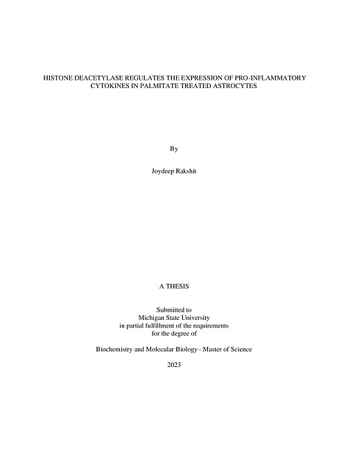 Neuroinflammation is defined as the activation of the brain's innate immune system upon injury. Cytokine release is a significant hallmark of neuroinflammation, and leads to neuronal death and neurogenerative disease. Palmitate, release cytokines via the Toll-like receptor (TLR) based NFkB inflammatory pathway. Additionally, histone deacetylases (HDAC) is associated with the upregulation of cytokine and NF-kB expressions. NF-kB is a transcription factor that upregulates the gene expression of proinflammatory cytokines; they are bound to the Ikβα complex in the inhibitory state and activated upon degradation of the Ikβα complex by the IKK complex. The major gap that this project aims to investigate is the role of HDACS, specifically in the palmitate treated astrocytes. I hypothesize that HDACs lead to the activation of the IKK complex to translocate NF-kB components in the nucleus to upregulate cytokine expression in palmitate treated astrocytes. This study demonstrates the impact of HDACs on cytokine expression upon palmitate treatment and molecular mechanisms involved. Pro-inflammatory cytokine IL-6, was significantly upregulated upon palmitate treatment, and treatment with palmitate and HDAC inhibitor valproic acid downregulated the expression of the cytokines. However, there was no significant change in cytokine expression when treated with valproic acid alone, suggesting that HDACs are involved in the palmitate induced cytokine pathway. Our results also suggest that HDACs impact cytokine expression through its catalytic activity, i.e., histone acetylation, or protein-protein interactions with the IKK complex. The latter is based on molecular docking analysis.