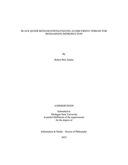 This dissertation, "Black Queer Being/Knowing/Feeling as Discursive Terrain for Reimagining Reproduction" centers and conceptualizes Black Queer folks' (cisgendered and non-cisgendered) lived experiences with gestation through storytelling. I put into dialog a study of in-depth interviews with Black queer gestational parents and discourse analysis of the only popular television representation of a Black Queer main character's gestational journey utilizing assisted reproductive technology in Netflix's Masters of None's "Moments in Love." By blending analysis of fictional storytelling and people's lived experiences, I highlight continuities and ruptures in reproduction discourses and raise possibilities for reimagining reproduction (e.g., reproductive health services, care, politics, and information) through a justice-oriented Black Queer lens.