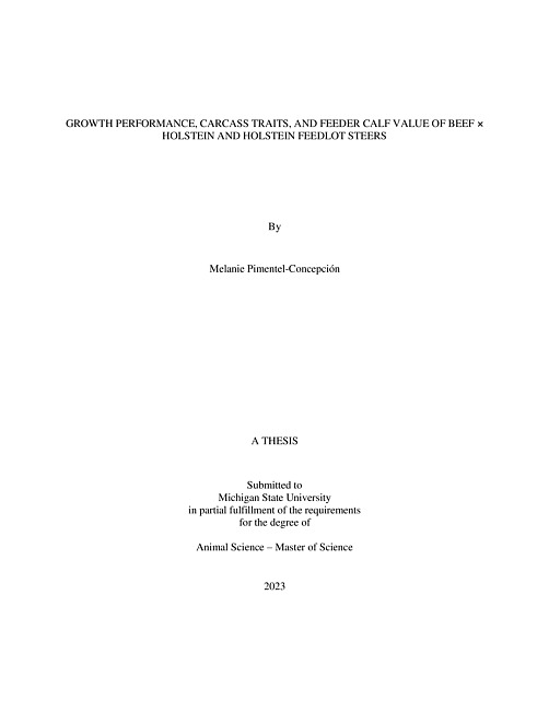 ABSTRACTGROWTH PERFORMANCE, CARCASS TRAITS, AND FEEDER CALF VALUE OF BEEF × HOLSTEIN AND HOLSTEIN FEEDLOT STEERS By Melanie Pimentel-Concepción This study evaluated and compared feedlot performance and carcass characteristics of B×HO and HO steers so that subsequent value could be calculated. Beef × Holstein steers did not show improved health in terms of morbidity or mortality when compared with their HO contemporaries. Hip height and frame scores were lower for B×HO, showing this one major packer concern could be improved. Crossbreds had a tendency for greater average daily gain (ADG), as well as having a greater gain-to-feed ratio (G:F), demonstrating that they were more feed efficient than their HO contemporaries. The dry matter intake (DMI) was similar between breed types. Even though the live final weight tended to be lesser for the B×HO, hot carcass weight (HCW) was similar. Similarly, dressing percentage and kidney, pelvic, and heart fat were not different. Fat thickness (FT) and longissimus muscle area (LMA) were greater for the B×HO, with no differences observed for marbling score when compared with the HO. Calculated USDA Yield Grade was lower for B×HO, demonstrating they had greater yield compared with their HO counterparts. In agreement, LMA:HCW was greater for B×HO, further demonstrating their greater yield and muscling compared with the HO steers. Empty body fat was not different (at an average of 28.0%) for the B×HO and HO steers, consistent with the study design to harvest on a similar basis. The USDA Quality Grades were not different for those grading Select or higher. Cost of gain was $0.17/kg lower for the B×HO. Compared with the HO, the B×HO had a $11.39/100 kg greater carcass value and, similarly, their breakeven feeder calf cost was $63.44/100 kg greater. Overall, health and DMI were not different between breed types. Beef × Holsteins tended to have better gains, were more feed efficient, and produced carcasses with greater muscling, FT, and better yield. Furthermore, B×HO had a lower cost of gain and greater carcass value, revenue, and breakeven feeder calf cost compared with their HO contemporaries. Future work should focus on studying specific sire breeds so that their influence on the traits discussed can be expanded on to reduce variability within a breed type.