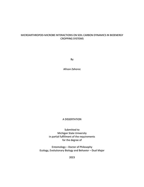 Soils, together with the vegetation they support, constitute the largest terrestrial carbon reservoir. However, human-driven land use change has caused significant carbon depletions in soils worldwide, particularly in managed ecosystems. As rising emissions threaten to exacerbate an already worsening climate crisis, strategies to replenish soil carbon stocks are imperative to mitigate further global warming. This is the main motivation for expanding second-generation bioenergy crop production in North America, with potentially substantial carbon gains possible in bioenergy cropping systems established on degraded soils. Yet in the face of uncertainties regarding the factors regulating carbon turnover and stabilization across diverse bioenergy cropping systems, the true potential for these systems to accrue carbon at meaningful rates remains unresolved. As the soil carbon cycle is directly controlled by microbial and plant processes, research has largely focused on investigating the physiological, climatic, and physiochemical factors regulating them in bioenergy cropping systems. However, very little is known about the microarthropods, small yet highly abundant and diverse soil fauna ubiquitous across ecosystems, these systems harbor. Microarthropod activity has long been known to have an important role in organic matter decomposition, yet they directly contribute relatively little to net soil carbon gains and losses due to their low biomass and metabolism. However, microarthropods can strongly influence microbes via a variety of mechanisms, including via direct microbivory, promoting nutrient availability, and altering organic matter quantity and chemistry. Thus, microarthropods can indirectly affect soil carbon dynamics by regulating microbial community structure, activity, and access to organic matter. The strength and direction of these microarthropod-microbe effects on carbon accrual, while presently unclear, will largely depend on the microarthropods and microbial communities involved, both of which are strongly dependent upon aboveground land use. In this dissertation, I approached this broad yet important knowledge by addressing the following key uncertainties: 1) what microarthropods are currently present in bioenergy cropping systems, 2) how do cropping system attributes affect their community structure, and 3) given the multitude of interactions and mechanisms operating simultaneously, what is the net impact of microarthropod-microbe interactions on soil carbon dynamics in these systems? In Chapter 1, I reviewed the literature on soil fauna effects on soil carbon cycling, narrowing my focus on these dynamics in context of perennial grass bioenergy cropping systems, and identifying where research is most needed to someday incorporate faunal activity in soil carbon models. In Chapter 2, I addressed the first and second major uncertainties by surveying microarthropod communities from bioenergy cropping systems ranging from an annual monoculture to a perennial polyculture. Over the span of two years, I found that perennial cropping systems consistently supported greater total microarthropod and mite abundances compared to the annual system. Having characterized the microarthropod communities in these systems, I addressed the third major uncertainty by conducting two greenhouse mesocosm experiments to evaluate the potential effects of these communities on key predictors of soil carbon accrual and stability. In Chapter 3, I investigated the effects of microarthropods from either a perennial or annual monoculture on microbial carbon use efficiency using a 18O-water tracer method. In Chapter 4, I narrowed my focus to perennial monoculture (switchgrass) communities to assess the relative effects of microarthropods and nematodes, alone and in combination, on nitrogen mineralization and switchgrass productivity. While I did not find conclusive evidence to suggest an effect on carbon use efficiency, I did find that microarthropods in combination with nematodes stimulated nitrogen mineralization from litter and subsequent assimilation into switchgrass roots, though only nematodes individually retained this positive effect. I conclude in Chapter 5 by reviewing the key takeaways from this research, discussing the broader implications of my findings as well as some of the methodological challenges associated soil fauna research I encountered, and suggesting future studies to address remaining questions. Despite the daunting uncertainties that remain, continued research into the complex interactions between microarthropods, microbes, and bioenergy crops will doubtlessly be important to better understand their potential contributions to soil carbon accrual and storage in bioenergy cropping systems.