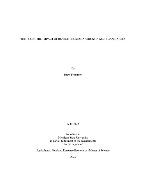 Bovine Leukemia Virus (BLV) is a zoonic virus that attacks the immune system of bovine (cows) and can lead to the development of bovine leukosis, lymphoma and lymphosarcoma. BLV can impact the productivity, longevity, and welfare of dairy cattle (Bartlett et al., 2014) and persists in over 94% of dairy operations in North America with an average herd prevalence of 46% (LaDronka et al. 2018). Our research project utilizes farm and cow level financial, production and biological data from four Michigan dairy farms over the span of five years to test for differences in partial profit across cows infected and not infected with BLV. Economic evaluations were based on a partial profit equation where we hold constant all revenues and costs not impacted by BLV. Each component of the partial profit equation is calculated using farm financial invoices and receipts, and production and biological data from each production year. Next, we used fixed effects regression analysis with the unbalanced panel dataset where we determined that BLV positive dairy cows had lower partial profit than BLV negative cows. Finally, through a sensitivity analysis on key partial profit input variables a range of partial profit loss for BLV positive cows was estimated to be between $198.34 and $496.76 per cow per lactation. The estimated loss in partial profit for BLV positive cows is greater when partial profit is calculated with energy corrected milk, which accounts for milk merit via fat and protein percentages, showing that BLV infection may have a greater negative impact on milk components such as fat and protein more so than total milk production. Given these estimates, for an average Michigan dairy herd of 550 cows and 46% herd BLV prevalence, we would expect an annual loss between $50,180.02 and $125,680.28 due to BLV infection.