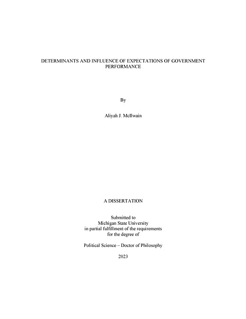 How are expectations of government performance developed and why do they matter? The literature on government expectations typically focuses on expectations of candidate behavior even though scholarship on policy feedback suggests that policy influences how and which constituents participate in the political system. I argue that these bodies of scholarship have failed to acknowledge the relevancy of citizens expectations of government performance—in this case, how well government provides the services that citizens expect from it. In a series of three essays, I explore how experience and identity influence expectations of policy outcomes, and finally how expectations impact political participation.