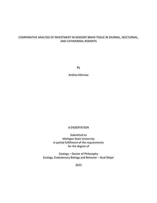 Transitions in temporal niche have occurred many times over the course of mammalian evolution and have been associated with changes in sensory stimuli available to animals. This is particularly true of visual cues because levels of light are so much higher during the day than night. For this reason, evolutionary transitions between diurnal, nocturnal, and cathemeral lifestyles are expected to be accompanied by modifications of sensory systems to optimize the ability of animals to receive, process, and react to important stimuli in the environment. In chapter one, I examine the influence of temporal niche on investment in sensory brain tissue of diurnal and nocturnal rodent species. To do this, I measured the size of five sensory brain regions that process olfactory information (olfactory bulbs), visual information (lateral geniculate nucleus, superior colliculus) and auditory information (medial geniculate nucleus, and inferior colliculus). A phylogenetic framework was used to assess the influence of temporal niche on the relative sizes of these brain structures. Compared to nocturnal species, diurnal species had larger visual regions, whereas nocturnal species had larger olfactory bulbs than their diurnal counterparts. Of the two auditory structures examined, one (medial geniculate nucleus) was larger in diurnal species, while the other (inferior colliculus) did not differ significantly with temporal niche. Our results suggest possible tradeoffs of investment between olfactory and visual areas of the brain, with diurnal species investing more in processing visual information and nocturnal species investing more in processing olfactory information. In chapter two, I investigate investment in sensory brain tissue of cathemeral species by measuring the size of five sensory brain regions that process olfactory information (olfactory bulbs), visual information (lateral geniculate nucleus, superior colliculus) and auditory information (medial geniculate nucleus and inferior colliculus). Using a phylogenetic framework, I assessed the influence of temporal niche on the relative sizes of these brain structures between diurnal, nocturnal, and cathemeral rodents. At a very general level, my data reveal that sensory structures in the brains of cathemeral rodents are not simply intermediate in size between those of diurnal and nocturnal rodents. Rather, cathemeral species were either distinctly nocturnal-like or diurnal-like. Cathemeral species had olfactory bulbs similar in size to diurnal species, and smaller than nocturnal species. One visual structure, the superior colliculus, was not influenced by temporal niche. The other visual structure, the lateral geniculate nucleus, was larger in diurnal species compared to both nocturnal and cathemeral species. The two auditory structures showed different patterns of investment. The inferior colliculus of the cathemeral and nocturnal species was similar in size, both of which were significantly smaller than diurnal species. The medial geniculate nucleus was similar in size between diurnal and cathemeral species, both of which were larger than that of nocturnal species. These results suggest a more complicated scenario than simply partitioning investment to accommodate activity in both day and night. In chapter 3, I carry out a more refined assessment of the lateral geniculate nucleus (LGN) in diurnal, nocturnal, and cathemeral rodents. In chapters one and two, I found LGN to be largest in diurnal rodents, compared to nocturnal and cathemeral rodents. The LGN is subdivided into three regions which carry out specific functions involved in visual processing and modulation of circadian rhythms. The subregions of the LGN were significantly larger in diurnal species, suggesting increased investment in regions that carry out visual processing and circadian functions. When comparing the ratio of the dorsal and ventral LGN, there was no influence of temporal niche. This suggests that factors other than temporal niche impact the sizes of these two substructures in relation to one another.