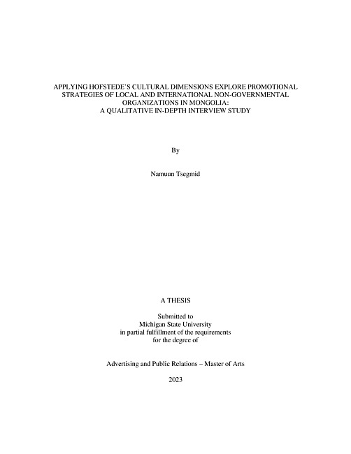 APPLYING HOFSTEDE’S CULTURAL DIMENSIONS EXPLORE PROMOTIONAL STRATEGIES OF LOCAL AND INTERNATIONAL NON-GOVERNMENTAL ORGANIZATIONS IN MONGOLIA : A QUALITATIVE IN-DEPTH INTERVIEW STUDY