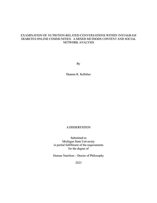 Diabetes is a chronic disease requiring daily self-management impacting over 37 million individuals in the United States. Those living with diabetes consistently work to maintain clinically acceptable blood glucose levels to prevent and delay long-term complications such as cardiovascular disease, nephropathy, neuropathy, and retinopathy. The length of time one has diabetes is associated with the development of these long-term complications at earlier ages. Therefore, type 1 diabetes (T1D) peak age of diagnosis of 10-14 years of age coupled with rising incidence of type 2 diabetes (T2D) in childhood, warrants greater focus on glycemic control influences in all age groups, but especially in those who are diagnosed at younger ages. Food and beverage choices are integral to daily self-management and ultimately blood glucose management. These choices are influenced by a host of factors including social media. Viewing health and nutrition posts on Instagram has been shown to be associated with greater body dissatisfaction and concerns with the development of disordered eating and subsequently elevated blood glucose levels. This study used a mixed methods approach that was first accomplished by completing a nutrition content analysis on 300 Instagram posts from two T1D-related hashtags to fully understand the type of Instagram users that post nutrition-related content and analyze the content being shared publicly for alignment with current diabetes nutrition recommendations. Descriptive statistics showed that the posts were created primarily by females, and persons with diabetes on a variety of topics with nearly half of all posts promoting a “diet”. Unfortunately, several potentially harmful diets such as the very low carbohydrate ketogenic diet and low carbohydrate diet were a key focus of Instagram posts. Next, social network analysis (SNA), both quantitative and qualitative, conducted on the T1D data set identified patterns of engagement of posts; networks among those engaging with the posts; and the themes of post comments. Engagement statistics for each post were analyzed using general linear modeling. Results demonstrated that Instagram posts related to nutrition education/food substation, food/beverage, and diabetes management were those with the greatest engagement. The qualitative analysis of comments highlighted six main themes within the posts including negative food relationships and overall support for others within this community. Finally, differences between the content analyses of nutrition-related T1D and T2D Instagram posts from four distinct diabetes associated hashtags were assessed. The descriptive statistics revealed differences between the types of Instagram post creators for the two groups with the T1D content creators mostly being persons with diabetes whereas the T2D content creators were primarily personal businesses. Differences in diets promoted between groups were analyzed using general linear models that showed the major contributor to promoting diets was the main theme of the post along with health information providers. This dissertation is the first to analyze nutrition-related content on Instagram within the diabetes online community, and hence groundbreaking. This research adds to the literature by elucidating the importance of incorporating social media as a component of healthcare assessments in addition to diabetes self-management education and support. Further, this research highlights the differences between the T1D and T2D nutrition-related Instagram communities relative to motivations for creating content and overall messages to better assist healthcare providers in addressing disease type (T1D vs T2D) specific factors that may contribute to development of long-term diabetes related complications.