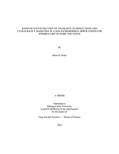 RAPID DE NOVO EVOLUTION OF TOLERANCE TO DESICCATION AND ULTRAVIOLET-C RADIATION IN A NON-EXTREMOPHILE : IMPLICATIONS FOR POSSIBLE LIFE ON MARS AND VENUS